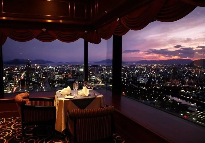 Das Hotelrestaurant, Confrere, auf der 25. Etage, serviert eine exquisite Mischung aus japanischen und internationalen Gerichten, zubereitet mit lokalen Zutaten. Das i-Tüpfelchen ist die Aussicht auf Hiroshima und die umliegenden Setouchi-Inseln.
