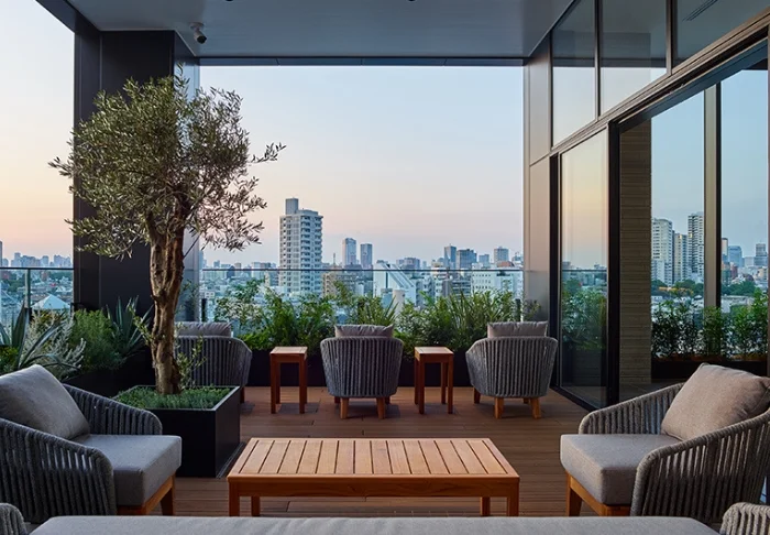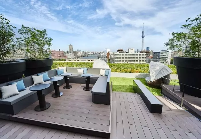 Nach einem Tag voller Erlebnisse können Sie bei einem Sonnenuntergangsgetränk auf der Dachterrasse des Hotels mit einem wunderschönen Panoramablick auf den Tokyo Sky Tree und den Sumida-Fluss entspannen.