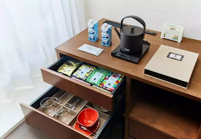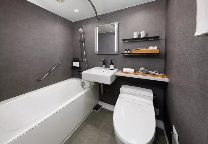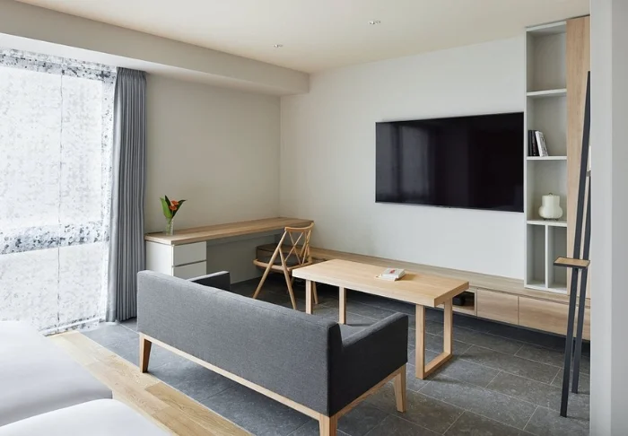 Das Hotel besticht durch ein modernes und stilvolles Design mit warmen Farbtönen und japanischem Minimalismus. Die Standardzimmer sind durchdacht mit allem ausgestattet, was Sie nach einem erlebnisreichen Tag benötigen, einschließlich WLAN, Klimaanlage, Kühlschrank, Fernseher und einem Wasserkocher, um Ihren Morgen mit einer Tasse grünem Tee oder Kaffee zu beginnen. Das funktionale Badezimmer ist mit Toilettenartikeln und einer Badewanne ausgestattet, in der Sie nach einem anstrengenden Tag entspannen können.