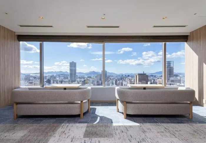 Die Zimmer sind einladend und geschmackvoll mit modernen Möbeln eingerichtet und bieten eine spektakuläre Aussicht auf die Stadt oder die umliegende Landschaft. Die Wände sind mit Kunstwerken verziert, die entweder den Wind darstellen, der über das Seto-Inlandmeer weht, oder Austern und Zitronen, zwei der Spezialitäten der Region. Alle Zimmer verfügen über WLAN, eine Minibar, Klimaanlage, einen Safe sowie einen Schreibtisch und einen Wasserkocher, um Tee oder Kaffee zuzubereiten. Die Badezimmer sind mit einem Haartrockner, Pantoffeln und Toilettenartikeln ausgestattet.
