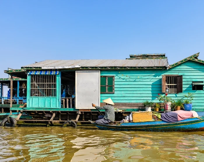 Die Tour geht weiter zum Tonle Sap Lake. Hier fahren Sie mit dem Boot zu einem der vielen Fischerdörfer am See, entweder Kompong Khleang (zwischen August und Anfang Februar) oder Chong Khneas (zwischen Mitte Februar und Juli). Im Dorf erfahren Sie mehr über den Alltag der vielen Familien, die primär vom Fischfang leben. Die Familien leben in bunten Häusern, die am Seeufer auf langen Stelzen stehen. So sind sie während der Regenzeit (August bis Anfang Februar) vor den hohen Wasserständen geschützt, wenn sich die engen Gassen des Dorfes in kleine Kanäle verwandeln. Während der Trockenzeit, wenn der Wasserstand niedrig ist, ragen die langen Stelzen aus dem Wasser.