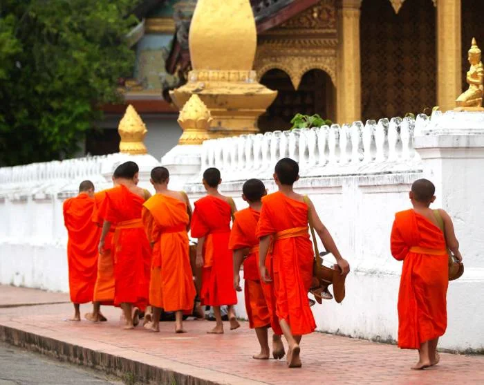 Jeden Tag in den frühen Morgenstunden findet in Luang Prabang eine ganz besondere Zeremonie statt. Dann laufen mehr als 300 Mönche still durch die Straßen der Stadt, um Almosen zu sammeln. Alle Familien schicken ein Familienmitglied mit Speisen oder Getränken auf die Straße, die in die Sammelbehälter der Mönche gegeben werden. Es gibt kaum jemanden, der nicht von der respektvollen Stille und großen Würde, mit der dieses tägliche Ritual stattfindet, ergriffen wird.