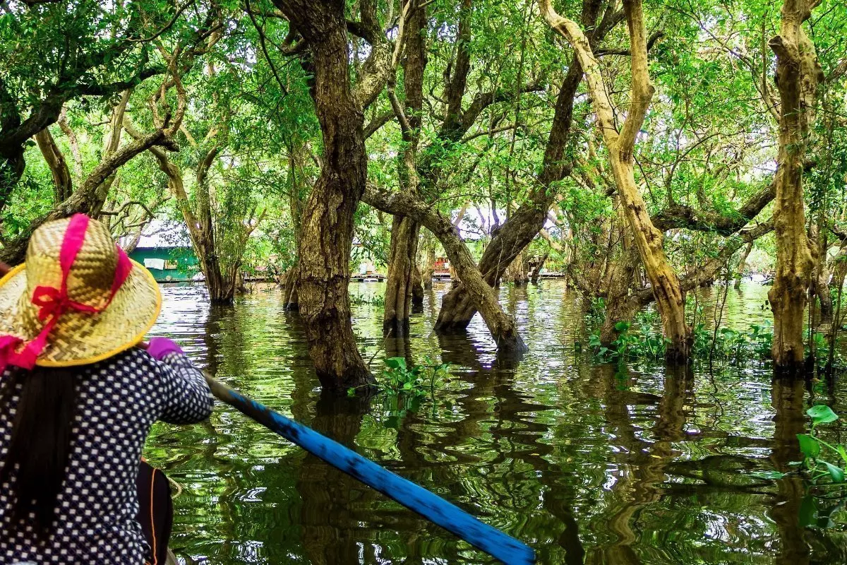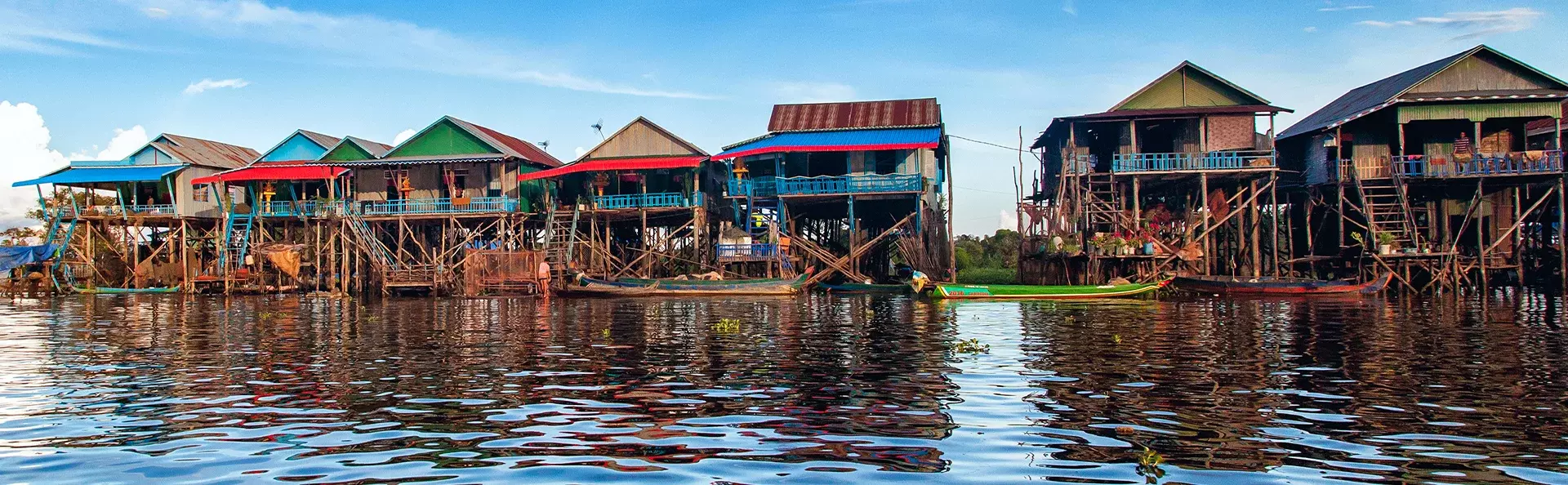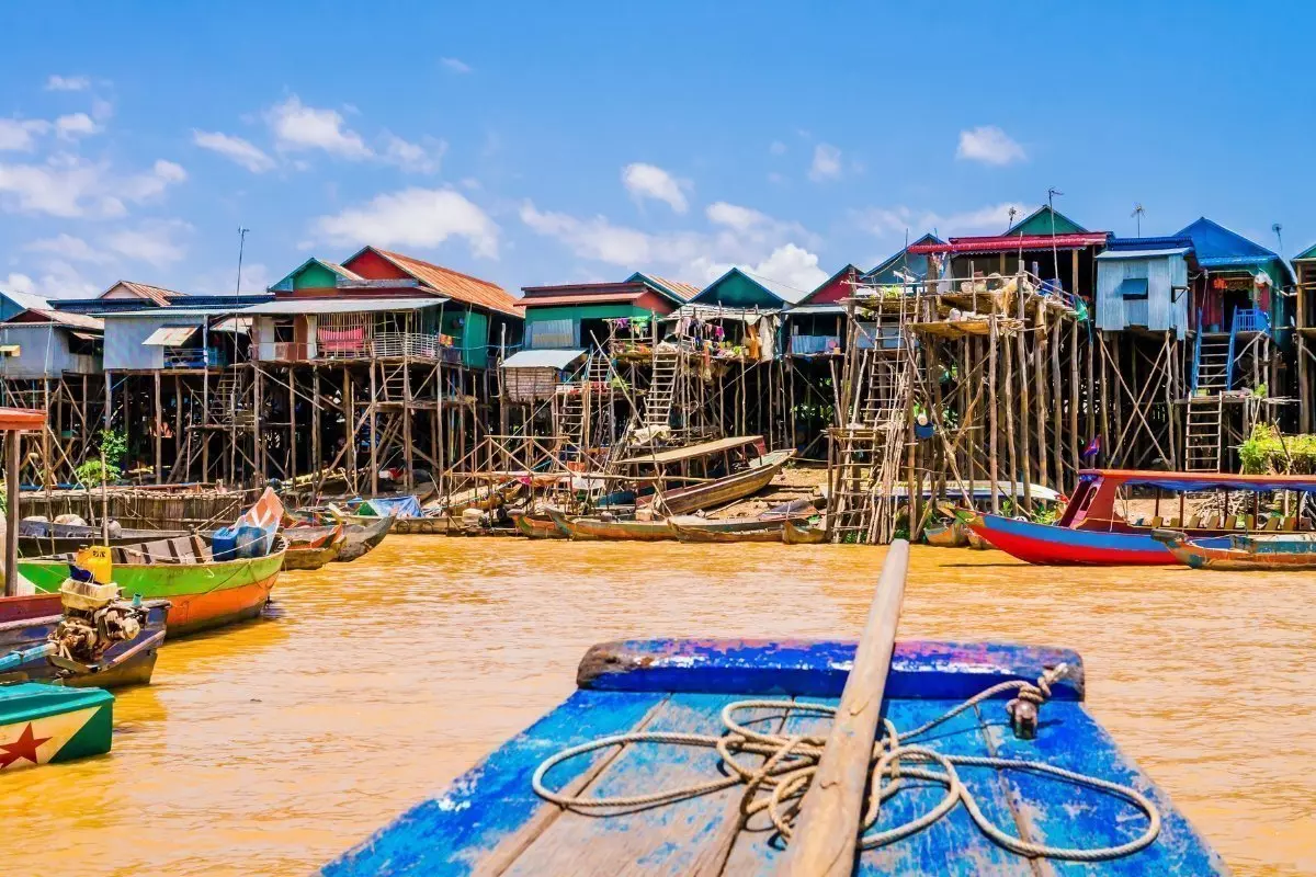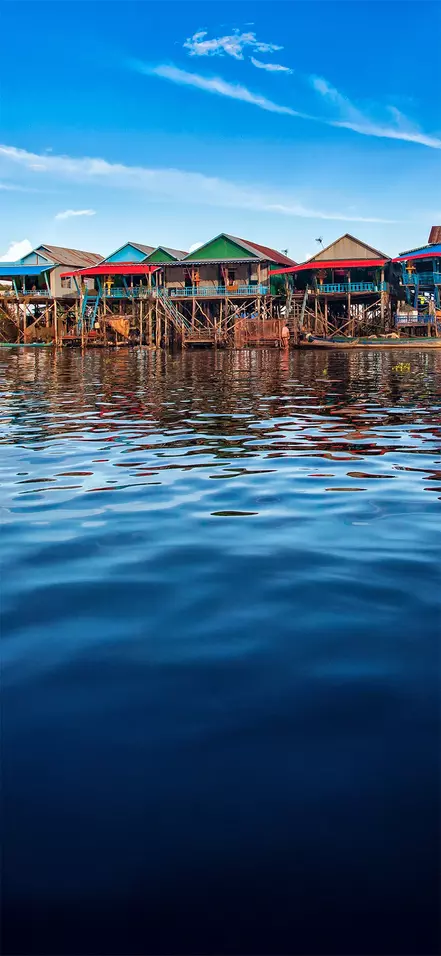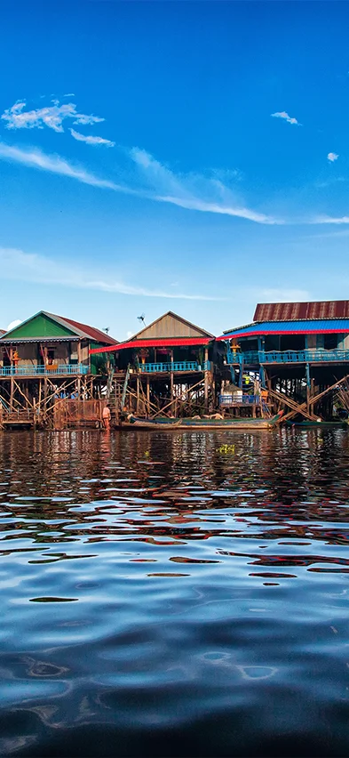 Sie kommen am Ufer des Sees Tonle Sap an und gehen an Bord eines Bootes, das Sie zum schwimmenden Dorf Kompong Phluk bringt. Dort erleben Sie hautnah, wie der Alltag der vielen Familien aussieht, die primär vom Fischfang leben. Die Familien leben am Seeufer in bunten Häusern auf langen Pfosten, sodass der hohe Wasserstand während der Regenzeit kein Problem ist. Dann verwandeln sich die schmalen Gassen des Dorfs nämlich in kleine Kanäle. Während der Trockenzeit, wenn der Wasserstand niedrig ist, können Sie die hohen Pfosten sehen.