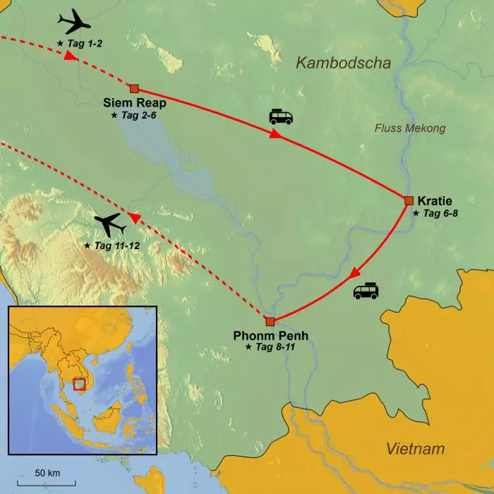 Bei dieser Reise erleben Sie die Kontraste zwischen Stadt und Land sowie die herrliche Mischung aus französischer Kolonialzeit mit wunderschönen Herrschaftsvillen, schattigen Alleen und der unglaublich präsenten buddhistischen Vergangenheit mit Tempeln, Pagoden und traditionellen Häusern. All das wird mit grüner Natur und nicht zuletzt wirklich freundlichen Einheimischen und dem stolzen kambodschanischen Volk gekrönt, von welchen die meisten Khmer sind.
