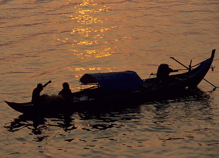 Abendliche Bootsfahrt auf dem Fluss Mekong in den Sonnenuntergang
