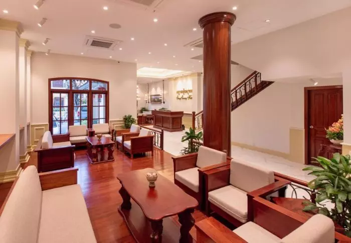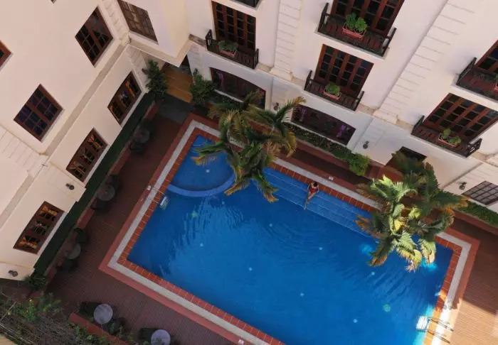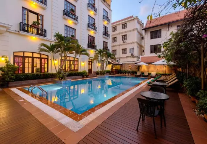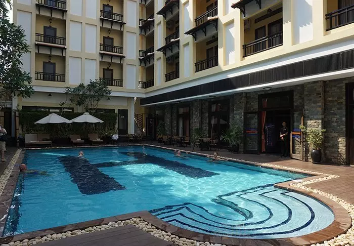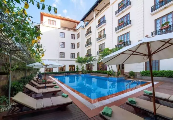 Man bekommt wirklich das Gefühl, in einer Oase zu sein, wenn man dieses Hotel betritt. Der Kolonialstil vermischt sich mit traditionellen Khmer-Dekorationen und sieht wirklich einladend aus.