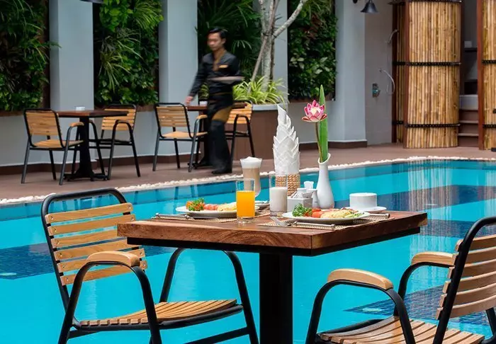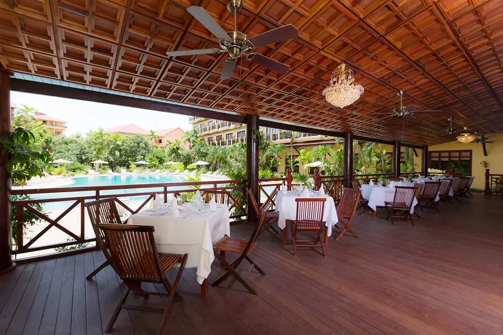 Neben dem Swimmingpool finden Sie das Restaurant und die Bar des Hotels. Das Restaurant bietet sowohl Buffet als auch à la carte und serviert internationale und kambodschanische Gerichte, während man an der Bar Bier, Wein, Schaumwein und bunte Cocktails genießen kann.