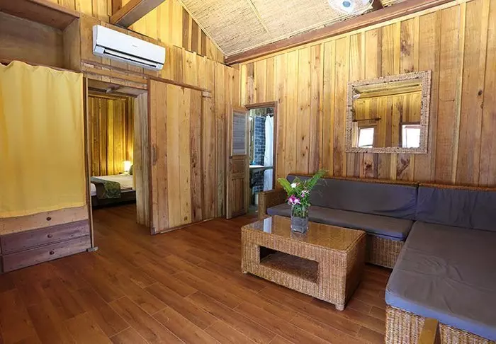 Sie übernachten in einem geräumigen, mindestens 70 m² großen Bungalow, der mit zwei Zimmern ausgestattet ist. Die beiden Räume werden durch eine Schiebetür voneinander getrennt. Auf der einen Seite befinden sich Schlaf- und Badezimmer, auf der anderen Seite ein Aufenthaltsraum mit Schlafsofa sowie ein weiteres Badezimmer. Darüber hinaus sind sie mit Klimaanlage, gratis WLAN, Safe, Minibar und Terrasse mit gemütlichen Sitzmöbeln ausgestattet. Föhns können an der Rezeption geliehen werden, Strandhandtücher werden an der Poolbar ausgegeben.