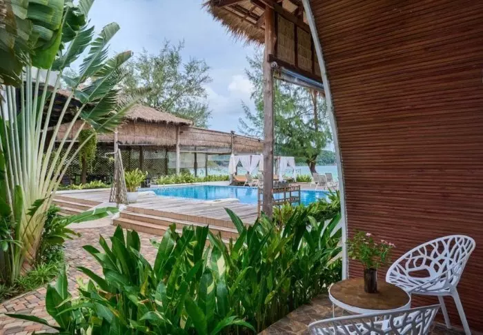 Das Veranda Natural Resort liegt auf einem grünen Hang unter dem Kep-Nationalpark, mit Aussicht auf die Thailandbucht, die Insel Tonsay und den Bokor-Hill-Nationalpark am Horizont. Das Resort erstreckt sich über ein 2,5 Hektar großes herrliches Naturgebiet, in dem viel Platz ist, um aktiv zu sein, aber auch, um Ruhe und Frieden zu finden. Im Resort wurde bei der Einrichtung viel Wert auf Schönheit, Ruhe und gutes Essen gelegt. Vom Hauptgebäude des Resorts aus verlaufen drei Holzbrücken durch das große grüne Gebiet zu den Zimmern. Die geräumigen, 30 m² großen Zimmer sind alle individuell in minimalistischem Stil mit luxuriösen Materialien, Klimaanlage, gratis WLAN, Kaffee-/Tee-Ecke, Minibar, TV-Gerät, Safe, Bademäntel, Föhn, eigenem Badezimmer und einer Veranda eingerichtet.