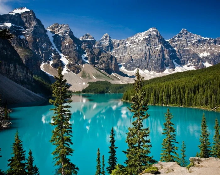 Anschließend geht es weiter zum Moraine Lake, dem beeindruckenden Bergsee im Valley of the Ten Peaks. Dort können Sie einen kurzen Spaziergang zu einem Aussichtspunkt machen, von dem man eine fantastische Aussicht über den tiefblauen See und die umliegenden Gipfel hat.