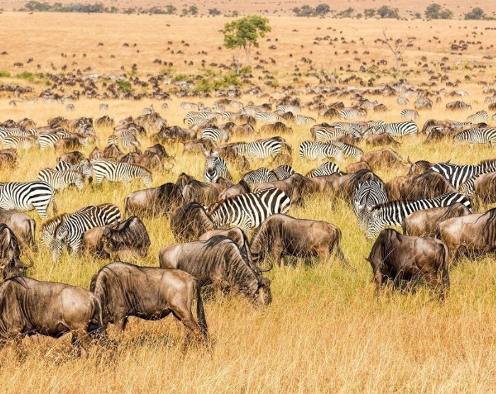 Von Juli bis Oktober kann man die 1.200 km lange Wanderung der über eine Million Gnus und der Hunderttausenden an Zebras sowie jede Menge Thompsongazellen bestaunen. Während dieser Wanderung fallen viele den enormen Nilkrokodilen zum Opfer, wenn sie den Mara River durchqueren.