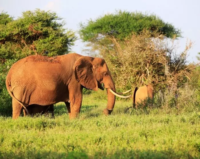 In Tsavo East ist der Boden leuchtend rot, was den Tieren ein unverwechselbares, rötliches Aussehen verleiht. Es ist etwas komisch, wenn man zum ersten Mal einen rötlichen Elefanten sieht!