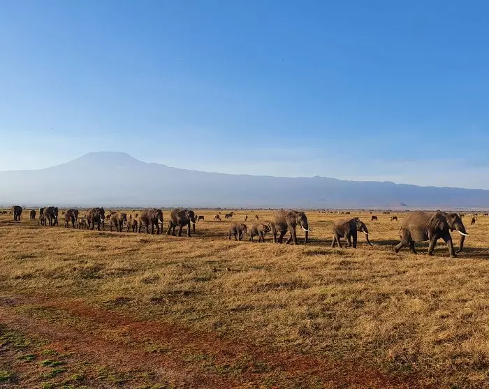 Die Reise geht weiter zum atemberaubenden Amboseli Nationalpark. Amboseli mag einer der kleinsten Nationalparks Kenias sein, aber der Anblick der Elefanten – die aufgrund der trockenen Landschaft leicht staubig sind – mit dem Kilimanjaro im Hintergrund ist sehr bewegend.