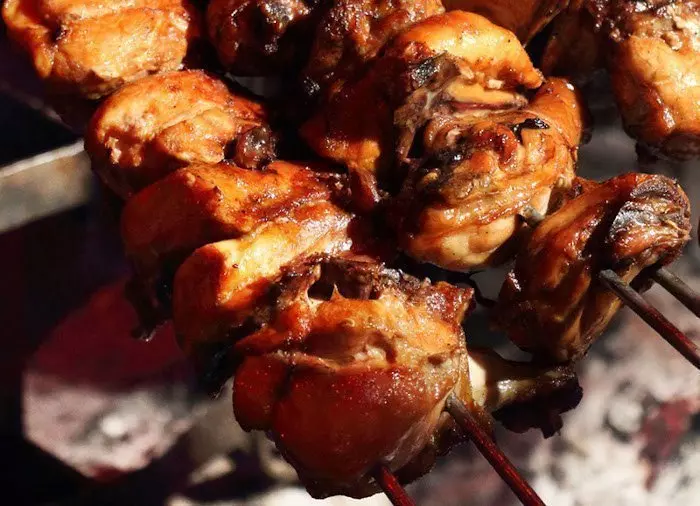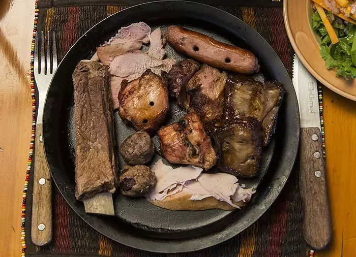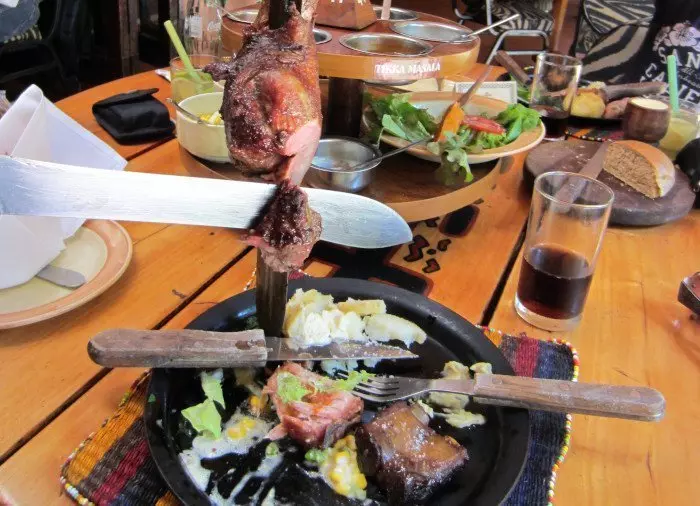 Das Fleisch wird im besten Masai-Stil über Grillkohle zubereitet. Das Konzept heißt „essen, soviel man essen kann“, bis man aufgibt und die kleine Flagge am Tisch senkt.