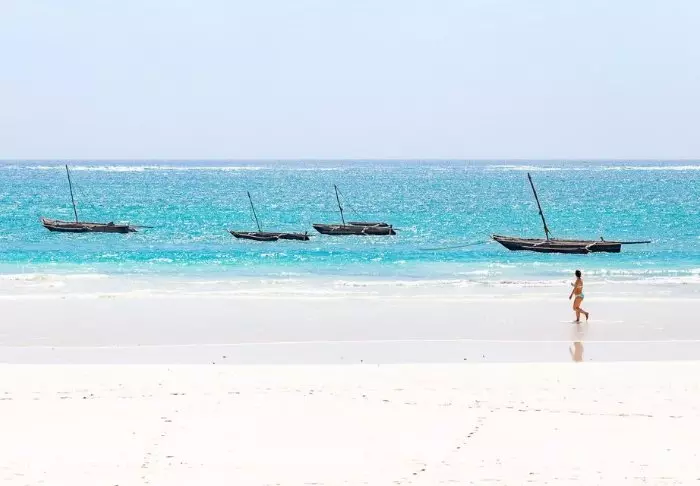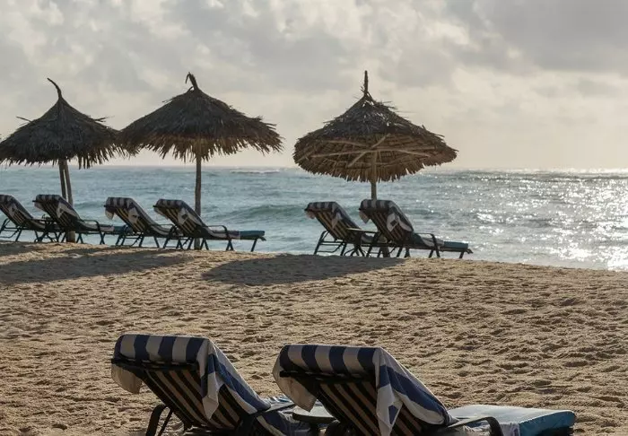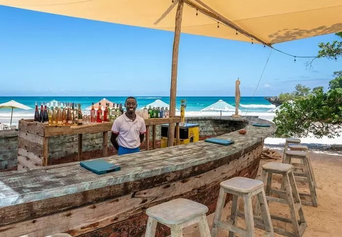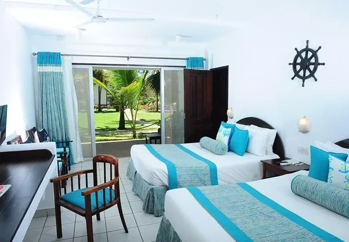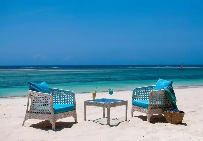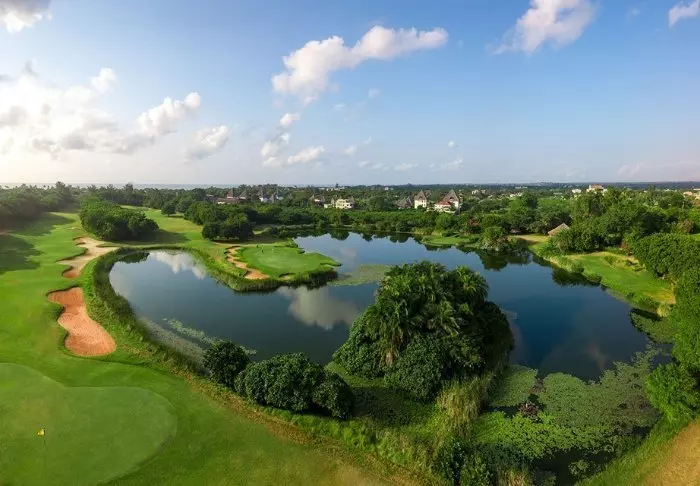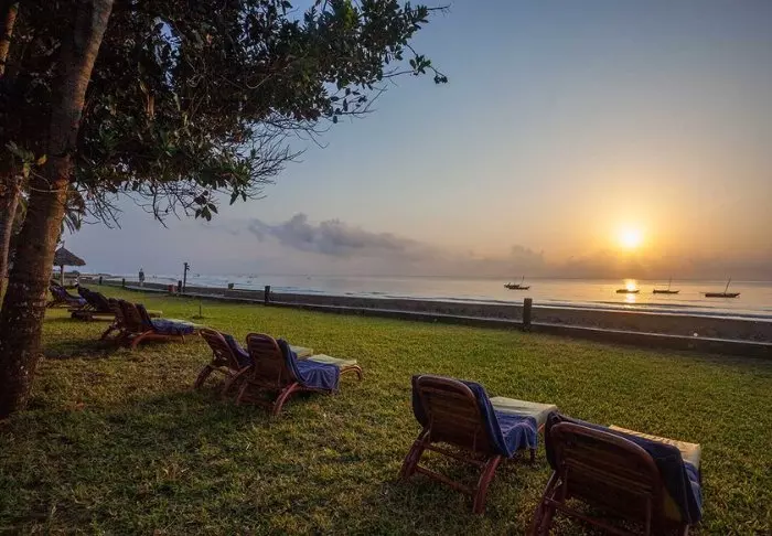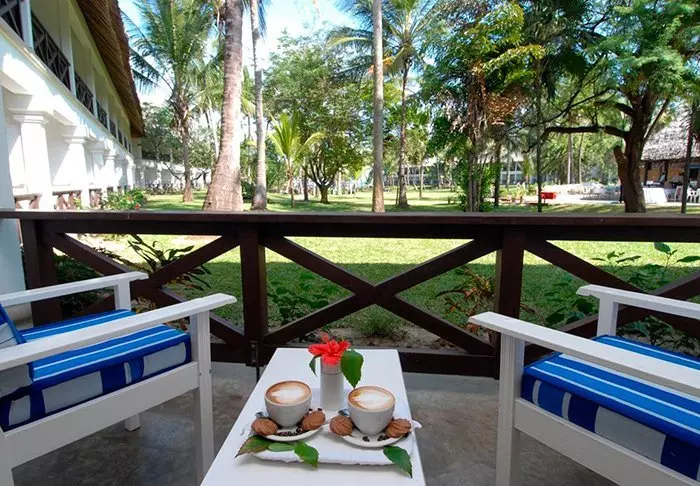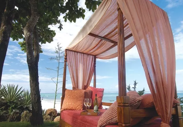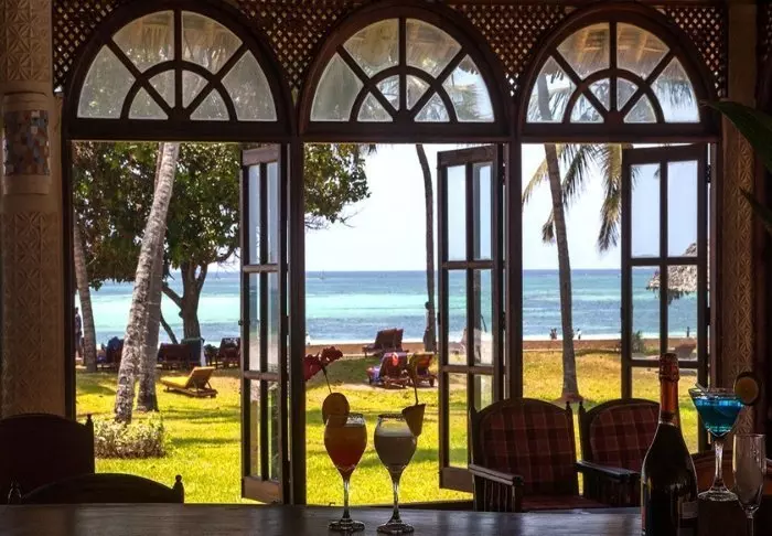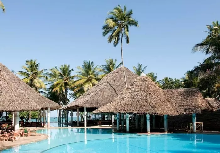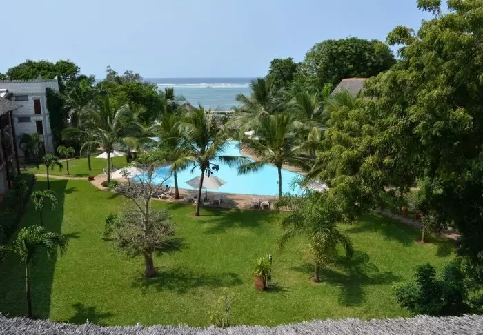 Das Resort liegt an einem der schönsten Strände der Welt, dem kreideweißen Diani Beach. Die Aussicht auf den Indischen Ozean sieht genauso aus wie auf den Urlaubspostkarten. Sogar vom 18-Loch-Golfplatz des Resorts aus blickt man direkt auf das türkisblaue Meer.