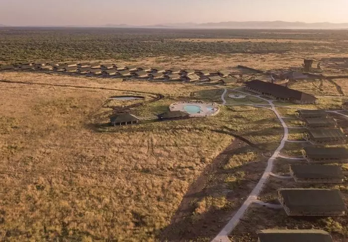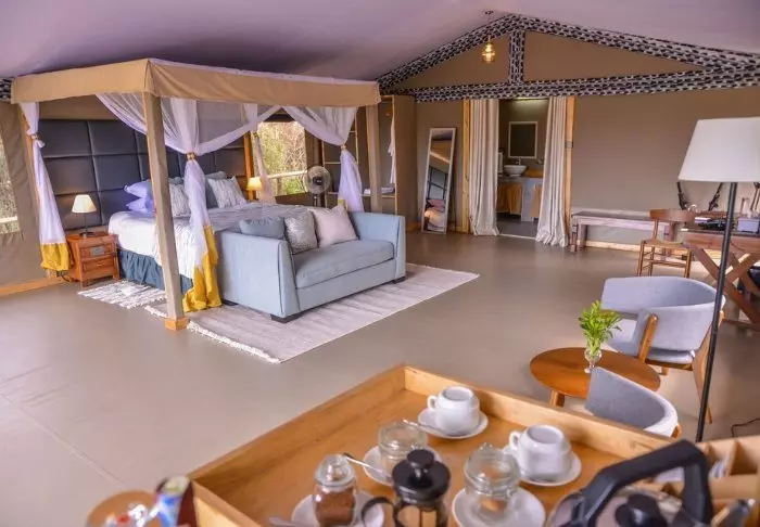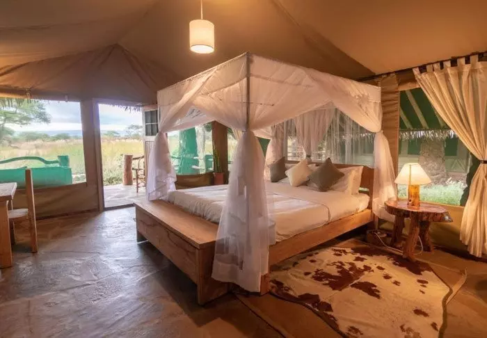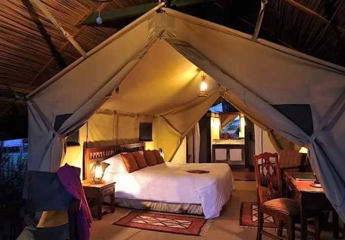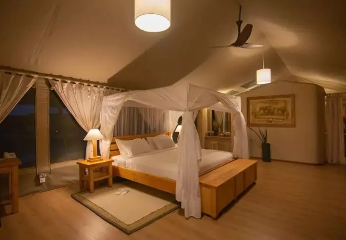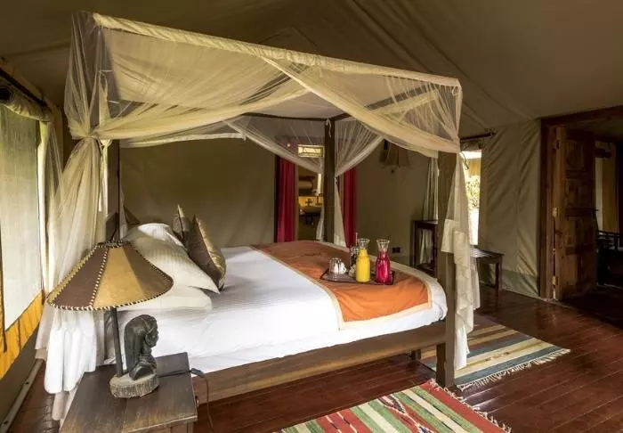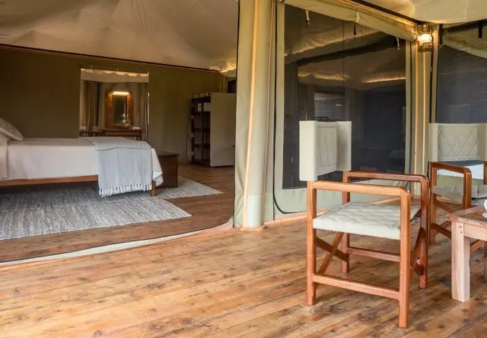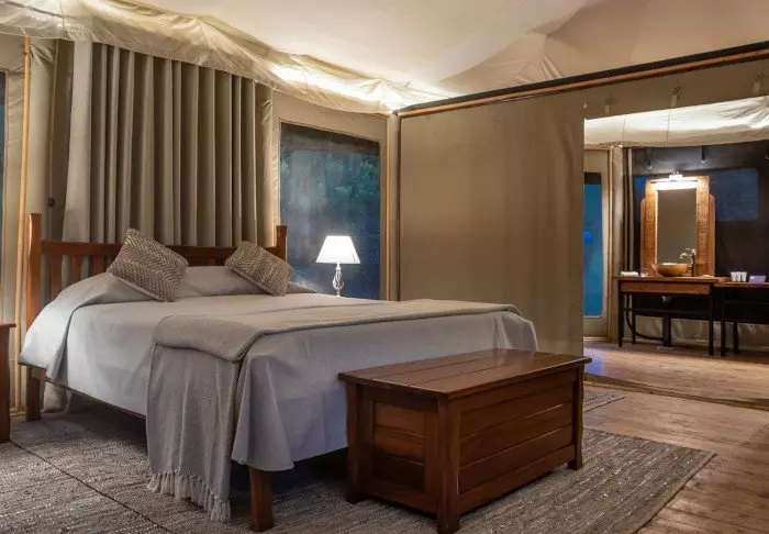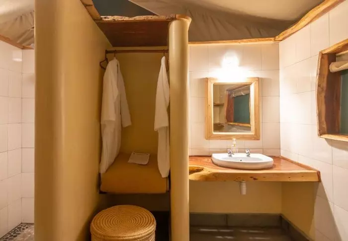 Hier übernachten Sie in einem der 60 großen und geräumigen Zelte, die über die Ebene verstreut sind. Jedes Zelt verfügt über komfortable Betten, eine kleine Sitzecke, einen Kühlschrank, eine Tee- und Kaffee-Ecke sowie eine eigene kleine Veranda und ein eigenes Badezimmer mit Dusche, Waschbecken und Toilette.