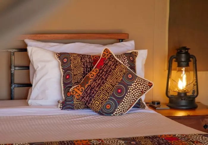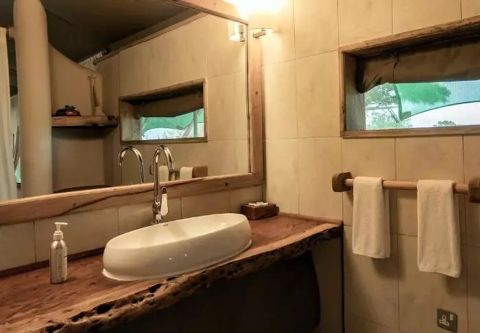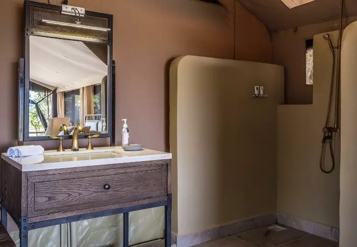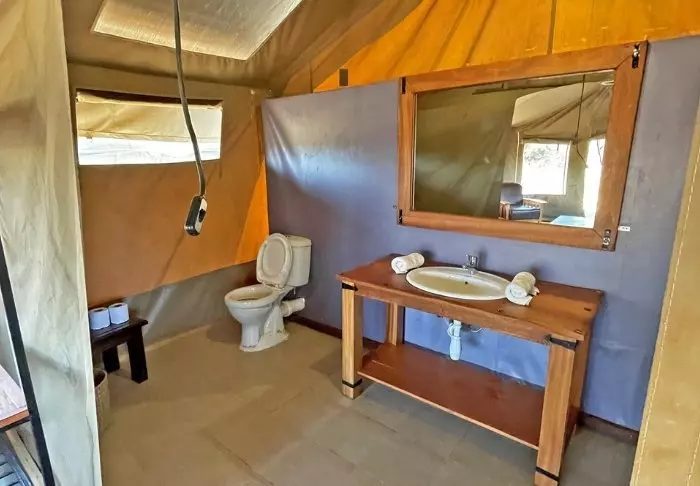Die geräumigen Zelte verfügen alle über ein eigenes Badezimmer mit kaltem und warmem Wasser und ein Wasserklosett. Die Böden in den Zelten sind fest und bestehen aus Parkett, während die Wände aus Canvas sind, sodass Sie die Natur draußen noch hören und riechen können. Ein richtiges „Buscherlebnis“, ohne dass Sie beim Komfort Kompromisse eingehen müssen.