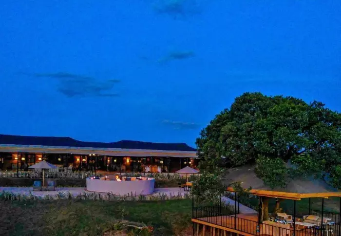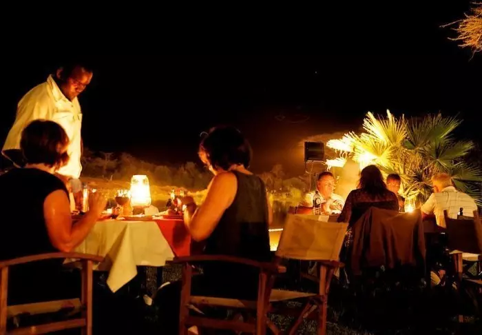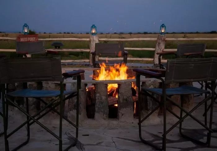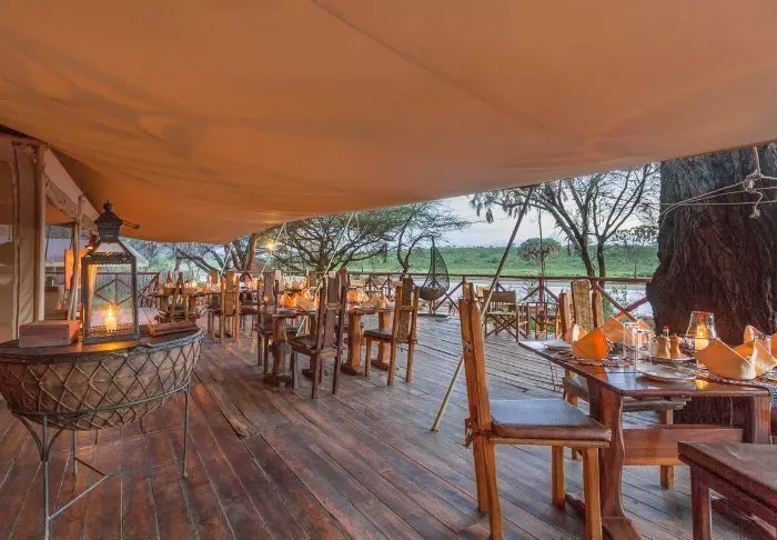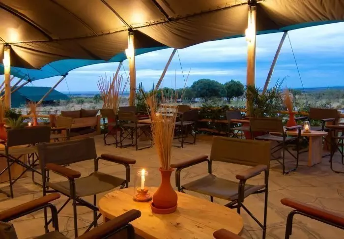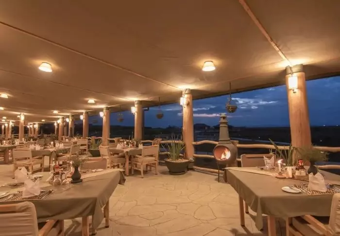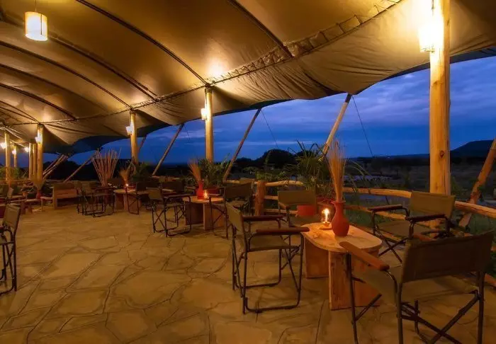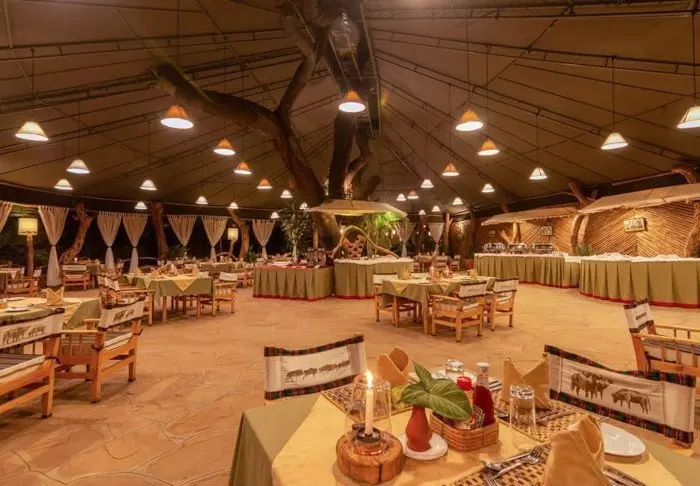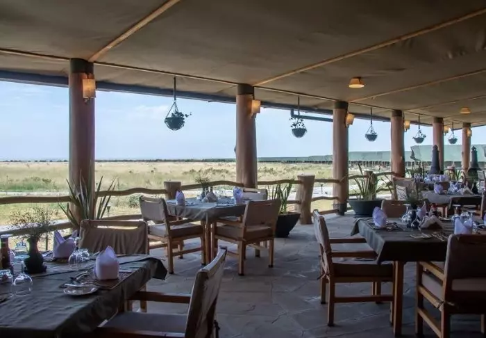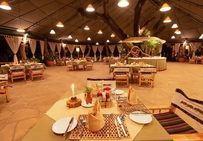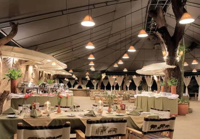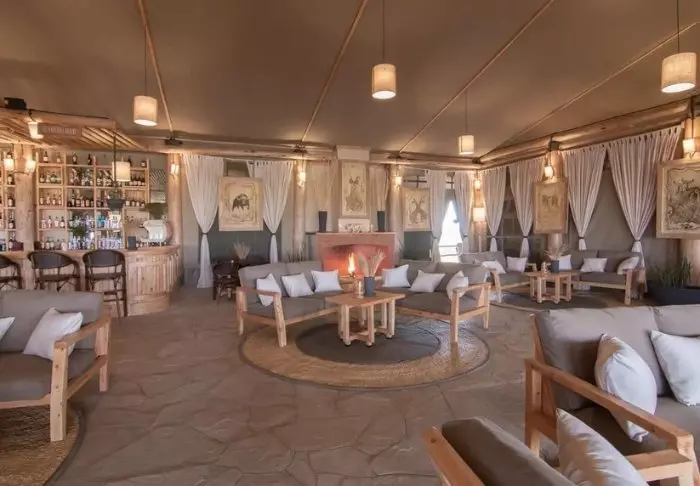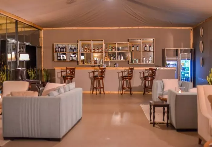 Die Mahlzeiten werden im Hauptgebäude serviert, in dem sich auch die Rezeption und eine gemütliche Bar befinden. An ausgewählten Abenden gibt es gelegentlich Live-Musik in der Bar. Vor dem Restaurant gibt es eine große Rasenfläche mit Bänken und gemütlichen Ecken, um die Aussicht auf das Wasserloch zu genießen. Zwischen dem Restaurant und den Zelten befindet sich ein Pool, umgeben von Sonnenliegen.
