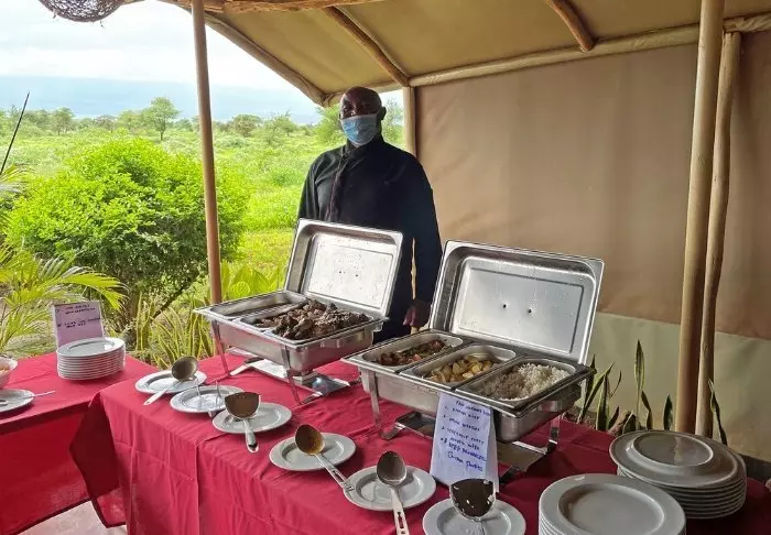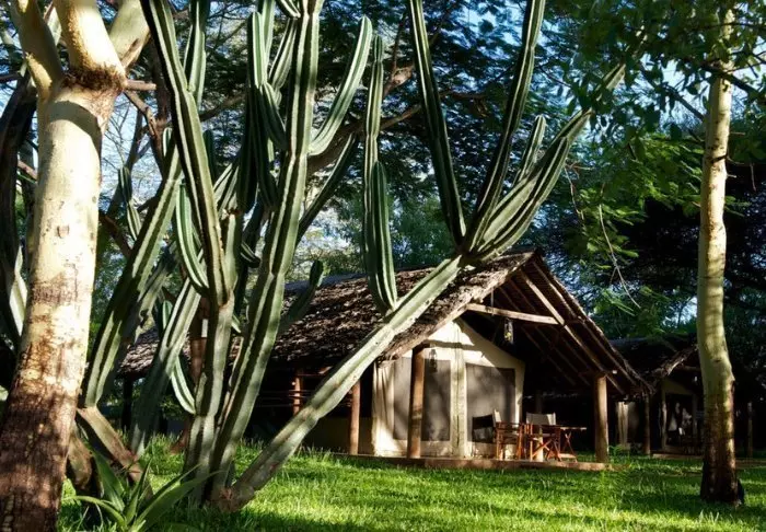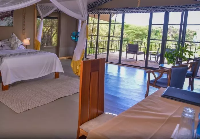 Die 25 Zelte liegen alle nebeneinander, wobei das Restaurant den natürlichen Mittelpunkt bildet. Das bedeutet auch, dass Sie überall eine herrliche Aussicht auf den See mit den Flusspferden und die Berge im benachbarten Tansania haben.