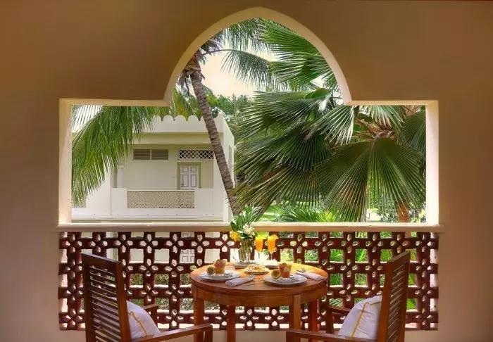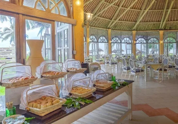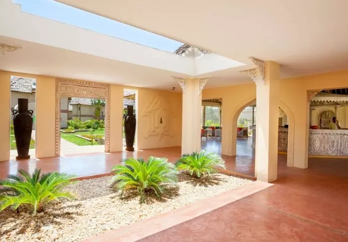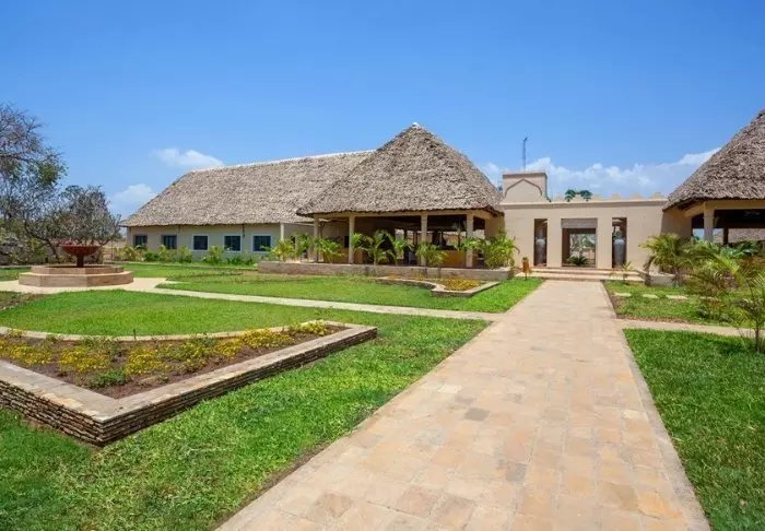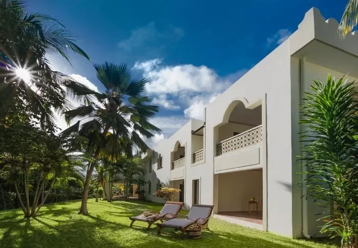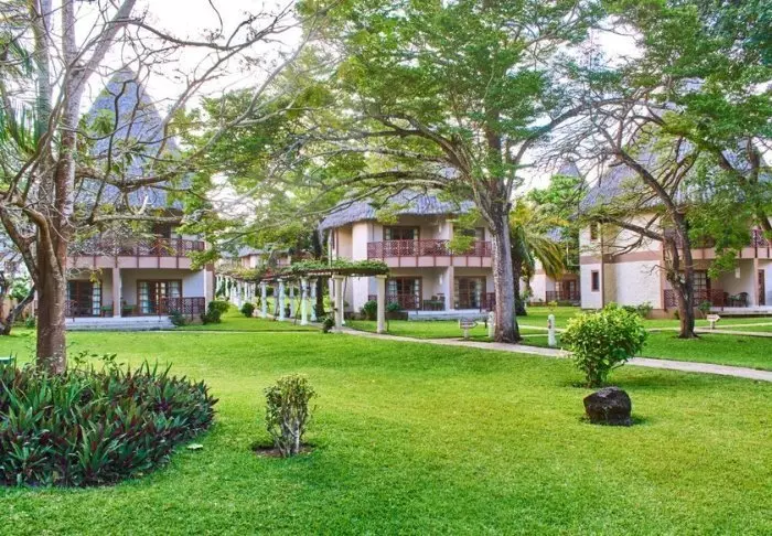 Das Resort ist von einem riesigen tropischen Garten umgeben und liegt an den weißen Sandstränden des türkisblauen Indischen Ozeans, wo das Wasser aufgrund der Korallen, welche die Wellen Bremsen, ruhig ist.