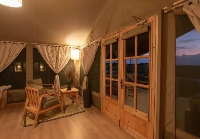 Die 12 Zelte wurden nach allen Regeln der Kunst mit weichen Betten, Holzboden, herrlichen Teppichen in wunderschönen Farben, viel Platz für das Bett, einen Tisch und Lehnstühle in den Zelten eingerichtet. Alle Zelte haben natürlich ein eigenes Badezimmer mit fließendem (warmem und kaltem) Wasser. Außerdem besitzen alle Zelte eine eigene Terrasse mit einem kleinen Pool, sodass Sie an heißen Tagen eine Abkühlung genießen können.