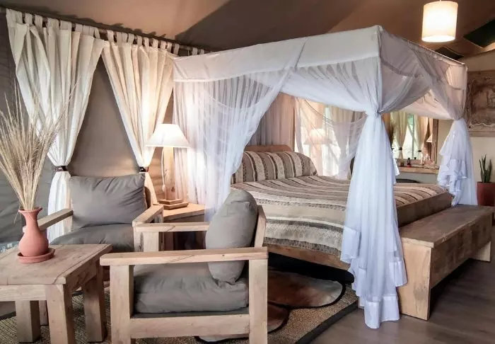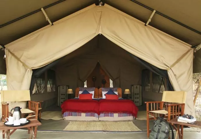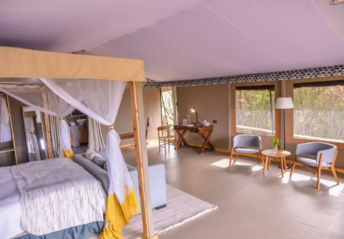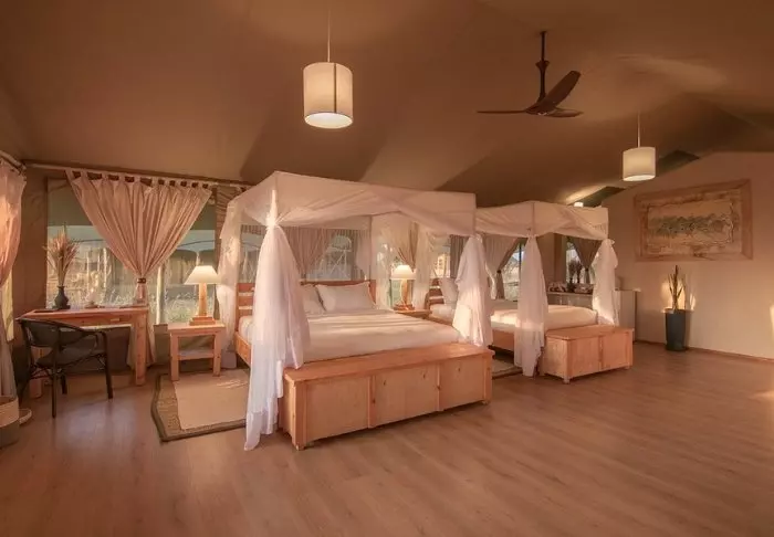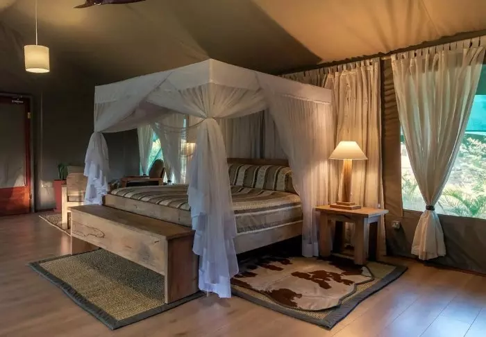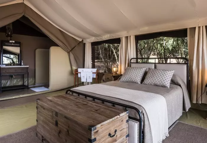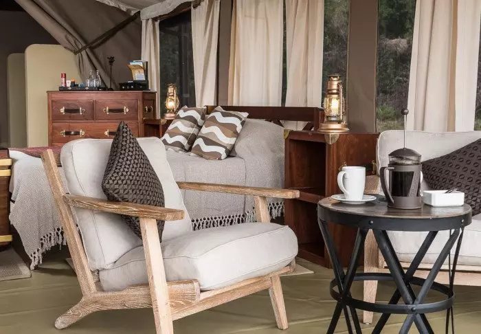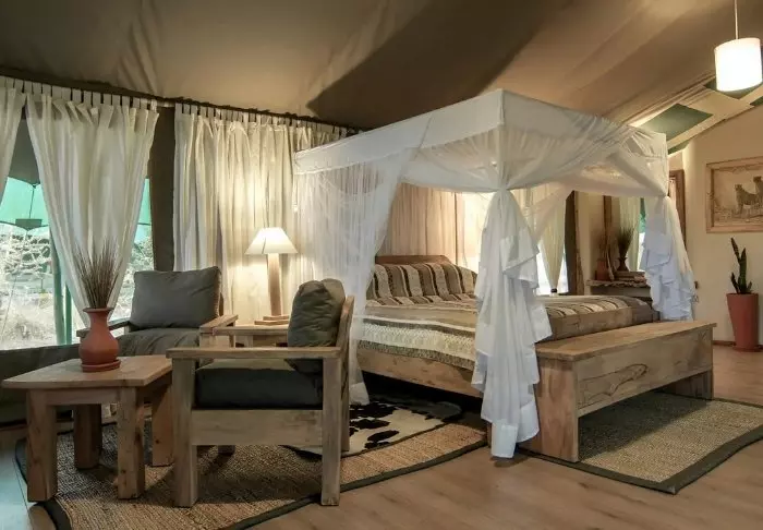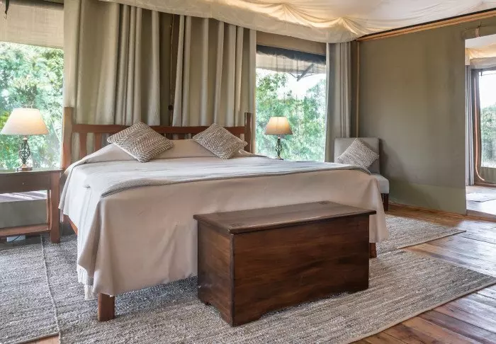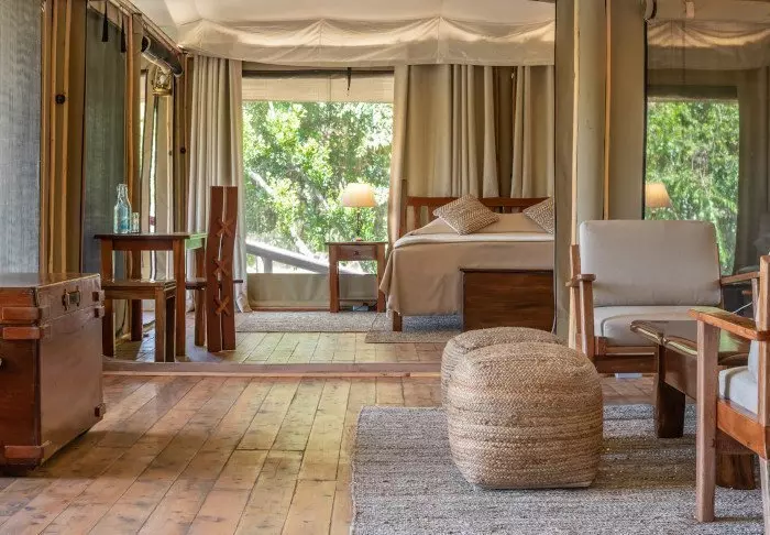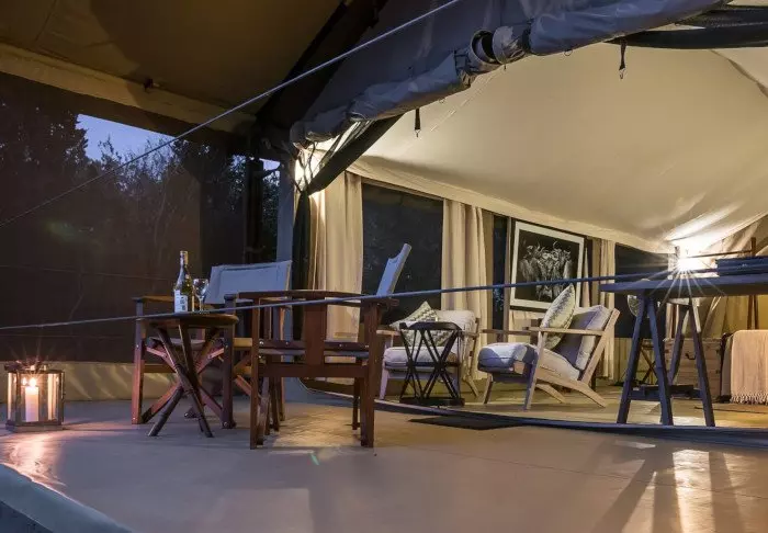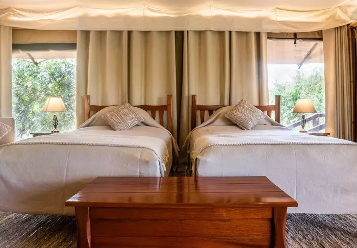 Jedes Zelt ist mit einem Ventilator, einem Wasserspender und Moskitonetzen über den Betten ausgestattet. Es gibt reichlich Platz für Ihr Gepäck und eine gemütliche Leseecke. Auf der Veranda befinden sich bequeme Sitzgelegenheiten, ideal um sich ein Glas Wein aus der Bar zu holen und den Sonnenuntergang über der afrikanischen Savanne zu genießen.