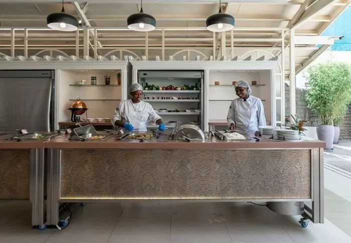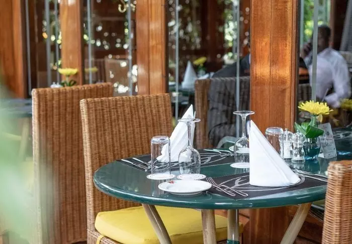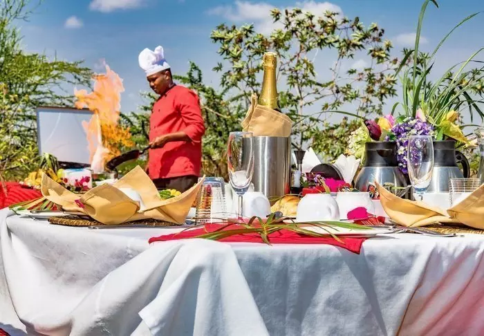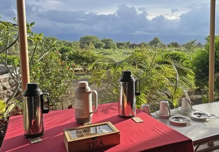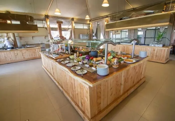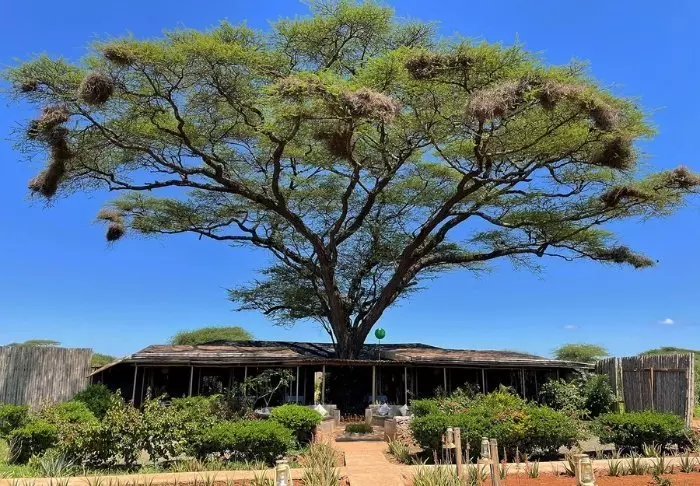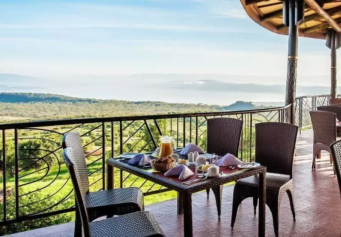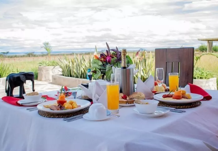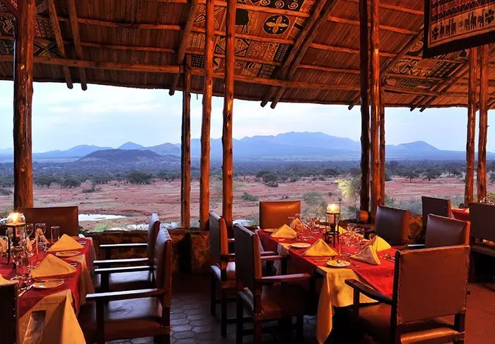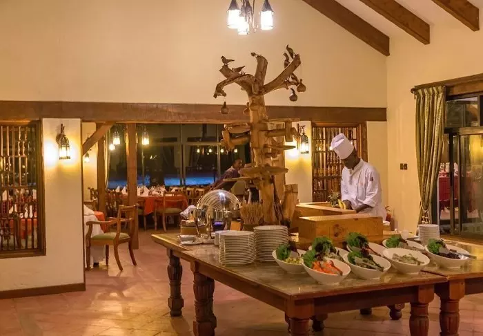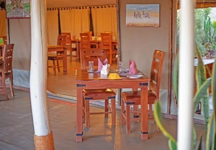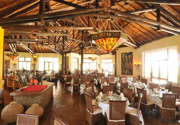 Die Mahlzeiten werden im Restaurant, das teilweise im Freien ist, mit Aussicht auf den Kilimandscharo eingenommen.