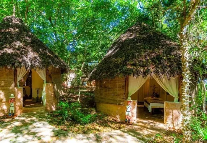 Die Lodge bietet 80 Luxushütten für je 2 Personen, die alle mit Doppelbett und Badezimmer ausgestattet sind. Die Zimmer sind modern und komfortabel eingerichtet. Sie wurden aus Naturmaterialien wie Gummibaum, Felsen aus der Umgebung und Schiefer erbaut.