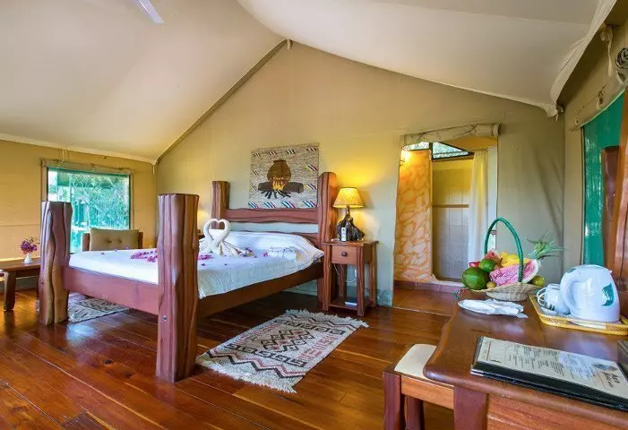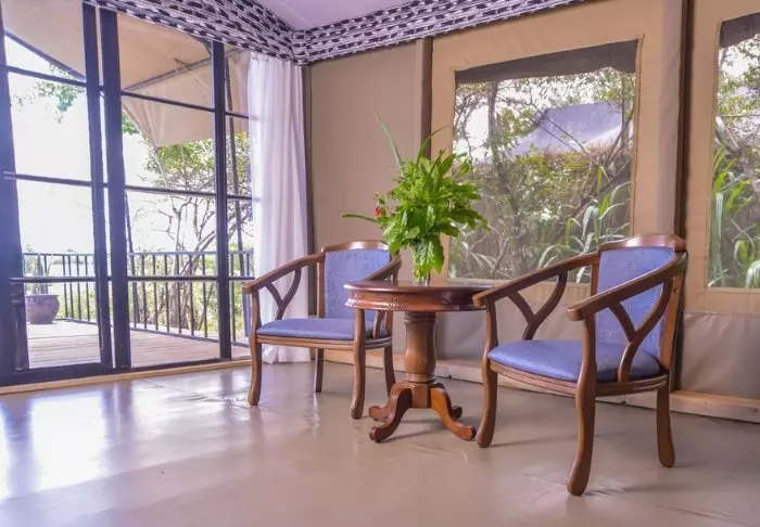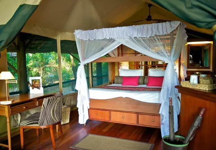 Die Einrichtung der Zelte hat einen ganz besonderen Charme. Sie sind mit einem festen Boden, viel Platz für den Koffer, einem kleinen Schreibtisch und einem eigenen Badezimmer ausgestattet. Genießen Sie vor dem Zelt auf den Stühlen der Veranda eine fantastische Aussicht. Die Wände bestehen aus Canvas, die Fenster aus Moskitonetzen. Auf diese Weise können Sie den Komfort genießen und gleichzeitig nachts den Geräuschen der Natur lauschen.
