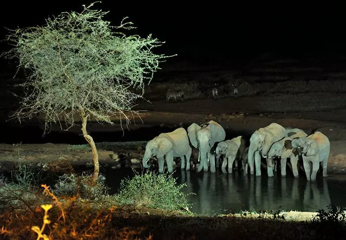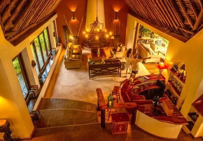 Die Lodge verfügt über einen zentralen, strohgedeckten Essbereich und eine Bar aus Naturstein. Das Restaurant und die Bar sind mit einer Terrasse verbunden, von der man einen direkten Blick auf die Wasserstelle hat.