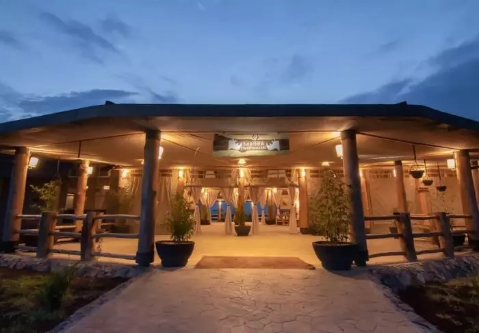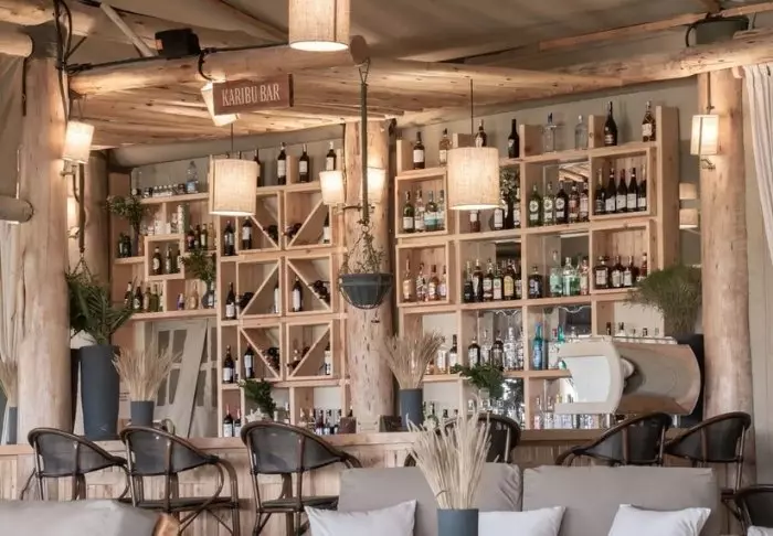 Bar und Restaurant laden zum gemütlichen Beisammensein ein. Hier kann man es sich auf weichen Sofas und in kleinen, flauschigen Ecken gemütlich machen. Beide sind, genau wie die Zelte, mit Naturmaterialien wie Holz und Stein erbaut. Die Farben sind dezent, sodass der Fokus auf die Natur gelenkt wird.