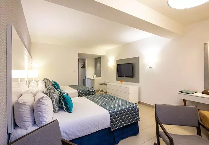 Das Resort besteht aus 170 Zimmern in verschiedenen Kategorien, die alle eine eigene Terrasse oder einen eigenen Balkon besitzen. Alle Zimmer verfügen zudem über Klimaanlage, WLAN, Tee- und Kaffee-Ecke, Minibar, Safe und Flachbildschirm-TV-Gerät.