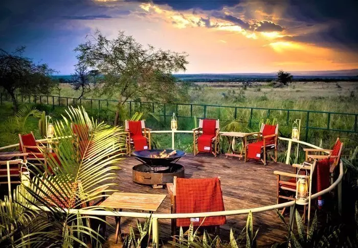Alle Zimmer besitzen eine eigene Terrasse mit einer wunderschönen Aussicht auf die Ebenen am Fuße des Kilimandscharos.
