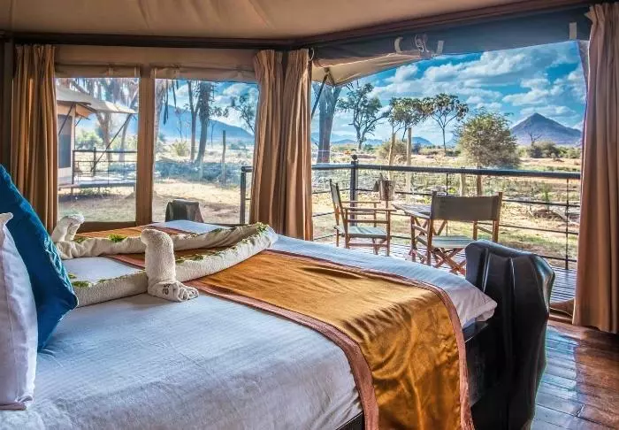 Es stehen 19 Zelte, die alle eine eigene Terrasse im Freien haben, zur Verfügung. Von diesen aus haben Sie eine wunderschöne Aussicht auf den Uaso-Nyiro-Fluss (was so viel bedeutet wie „brauner Fluss“). Es handelt sich um den drittlängsten Fluss Kenias, der auf viele Arten eine Lebensader für den Norden Kenias ist.