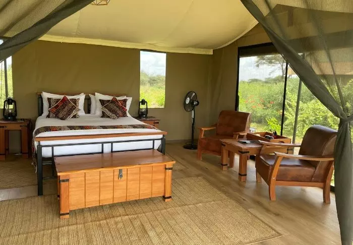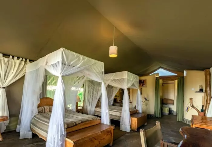 Die Zelte sind groß und toll eingerichtet. Zu den Betten gehören richtige Decken und herrliche Baumwollleintücher. Die Kultur der Masai spiegelt sich in der Dekoration mit bunten Bettdecken und handgefertigten Möbeln wider. Alle Zeltwände bestehen aus Kanevas, auch die Badezimmer. Aber es gibt eine richtige Toilette, fließendes Wasser und eine Dusche. Sie gehen daher keinen Kompromiss in Bezug auf den Komfort ein, obwohl Sie in einem Zelt übernachten und den Busch hören und riechen können. Vor jedem Zelt gibt es eine eigene kleine „Veranda“ mit Safaristühlen und -tischen. Wir denken, dass Sie hier einige Stunden damit verbringen werden, die umliegende Natur zu beobachten.