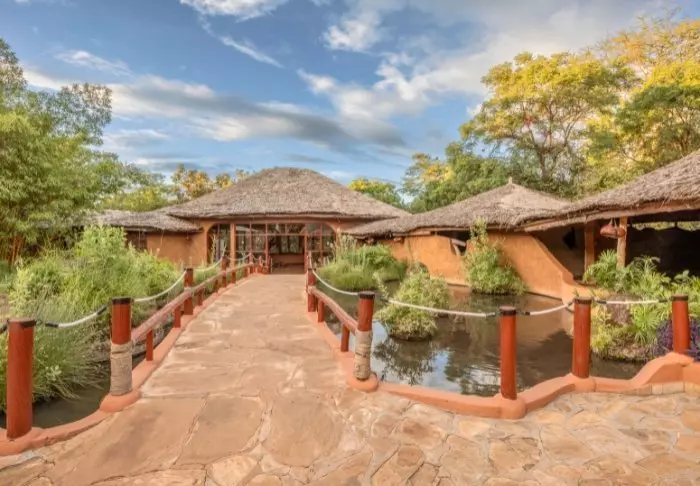 Die Lodge hat ihr eigenes Wasserloch, das die Tiere anlockt. Für die Menschen gibt es einen tollen Pool, in dem man sich erfrischen kann. Außerdem findet man hier ein Restaurant, eine Poolbar, und man kann eine Massage buchen. Auch ein kleiner Souvenirladen befindet sich in der Lodge.