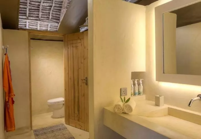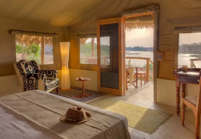 Die Zelte sind auf Zementplattformen errichtet und leicht vom Boden erhöht, mit Wänden und Dächern aus Segeltuch. Die Segeltuchdächer sind von einem charakteristischen afrikanischen Strohdach geschützt, das sowohl Schatten vor Sonne als auch Schutz vor Regen bietet.