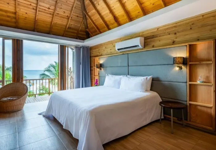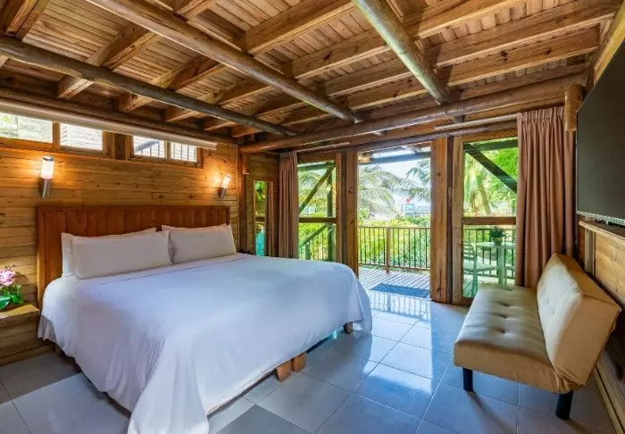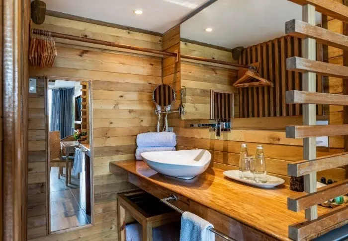 Mit gerade einmal 42 Zimmern garantiert das Hotel einen gemütlichen und intimen Aufenthalt. Jedes Zimmer ist aus Holz und Bambus gefertigt und fügt sich perfekt in die natürliche Umgebung ein. Die Zimmer sind mit Klimaanlage, WLAN, Satelliten-TV, Minibar/Kühlschrank, Safe und einem privaten Bad mit Hygieneartikeln ausgestattet.