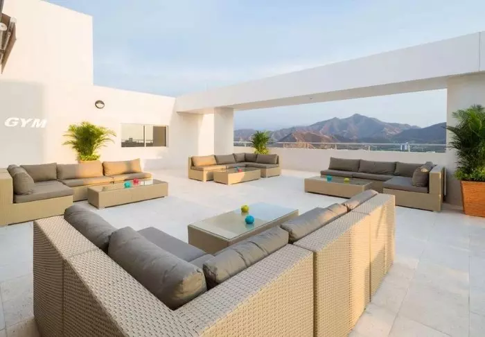 Entspannen Sie auf der Dachterrasse des Hotels im Jacuzzi oder genießen Sie die Sonne sowie den beeindruckenden Ausblick auf die Skyline von Medellín.