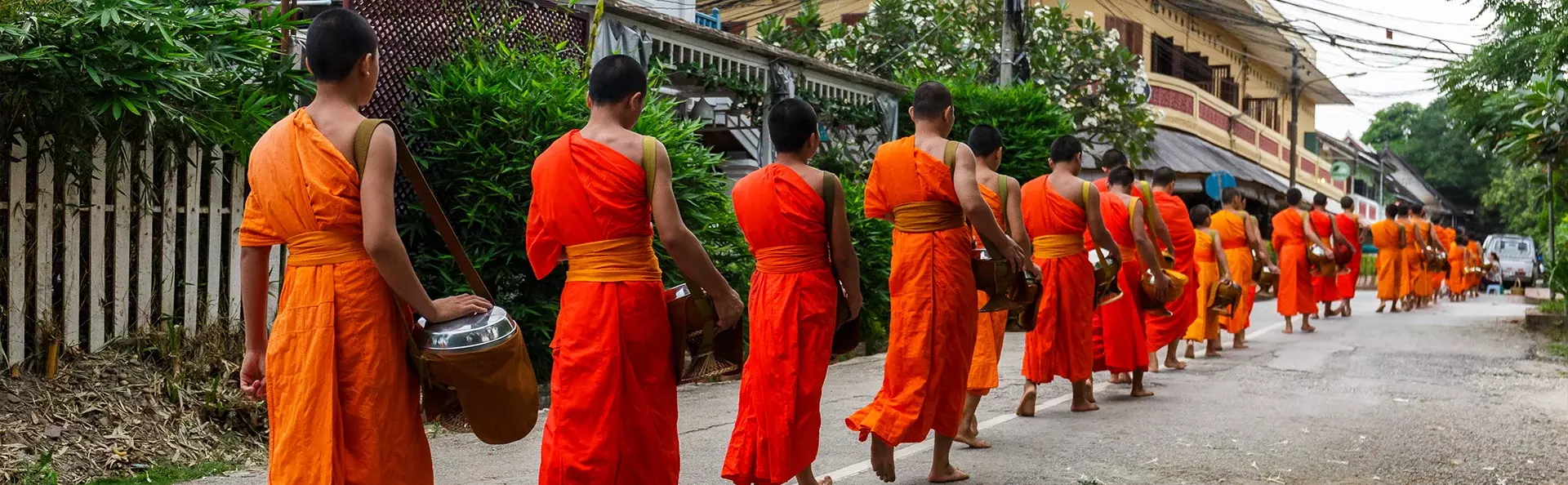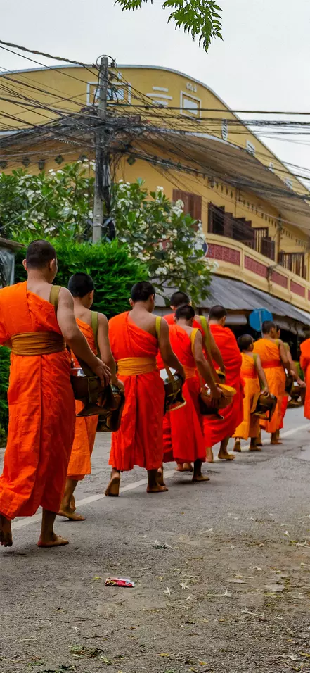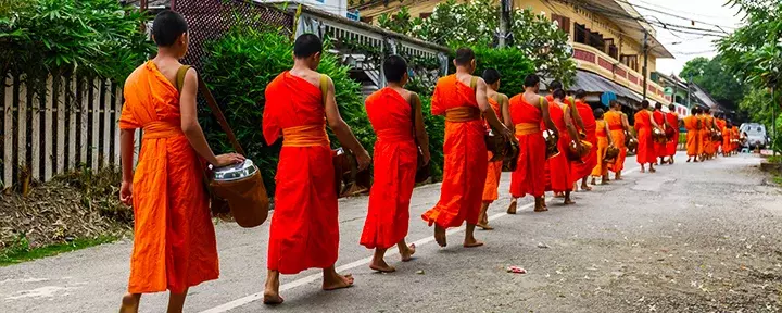 Jeden Morgen in den frühen Stunden spielt sich in Luang Prabang ein ganz besonderes Ritual ab. Hunderte Mönche ziehen lautlos durch die Straßen der Stadt und sammeln Almosen ein. Aus jeder Familie tritt ein Mitglied nach draußen und überreicht den Mönchen Essen oder Getränke, die respektvoll in deren Schalen gelegt werden. Die stille Würde und das ehrfurchtsvolle Schweigen, das diesen täglichen Brauch umgibt, berührt jeden Besucher.