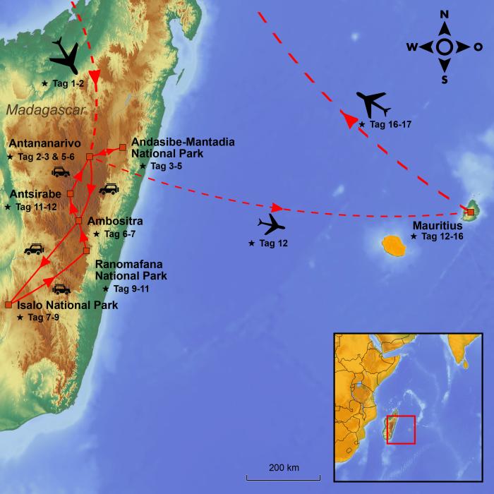 Ihnen steht ein Fahrer-Guide zur Verfügung, und Sie reisen in einem guten und komfortablen Auto (oder Bus – je nach Anzahl der Personen) mit Klimaanlage und guter Federung. Lehnen Sie sich also einfach zurück und genießen Sie die Eindrücke auf der Reise durch Madagaskar, das oft als achter Kontinent der Welt bezeichnet wird.
