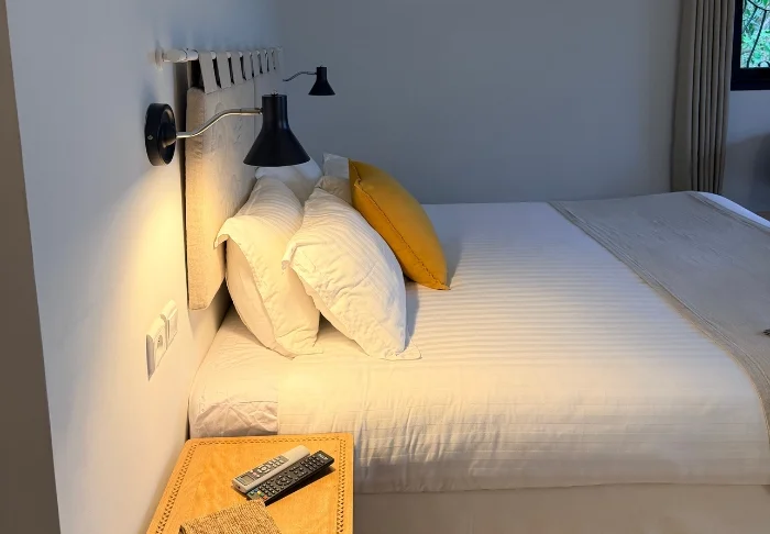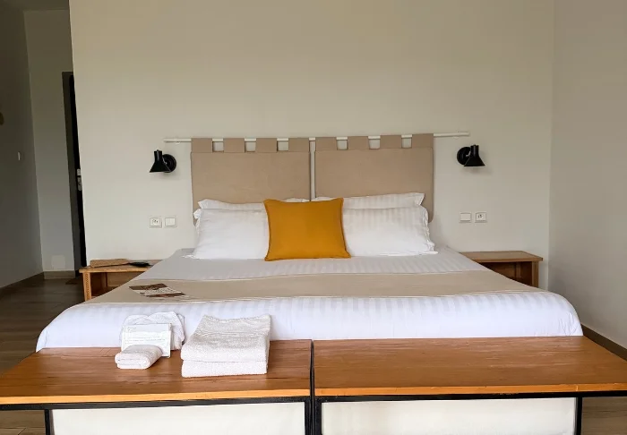 Die Zimmer liegen an einem vom Regenwald umgebenen Hang, und die Einrichtung ist hell und warm – eine Mischung aus nordischer Schlichtheit mit einem Hauch von Bali.