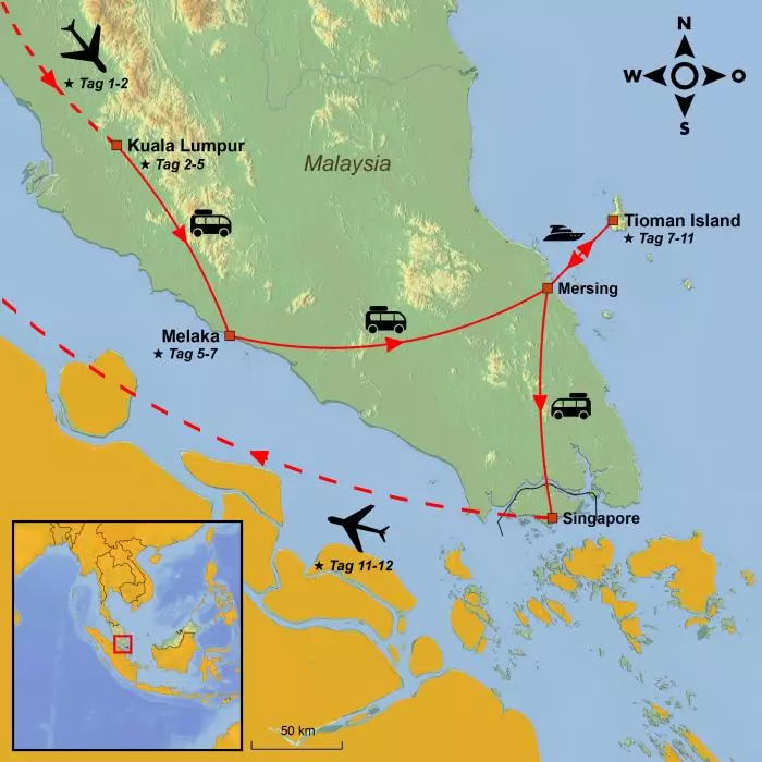 Auf dieser Reise können Sie Malaysias pulsierende Hauptstadt Kuala Lumpur erleben und in Melakas faszinierende Geschichte eintauchen, bevor Sie sich auf den Weg zum Schnorchelparadies Tioman Island machen, wo ein ruhiges Inselleben auf Sie wartet.