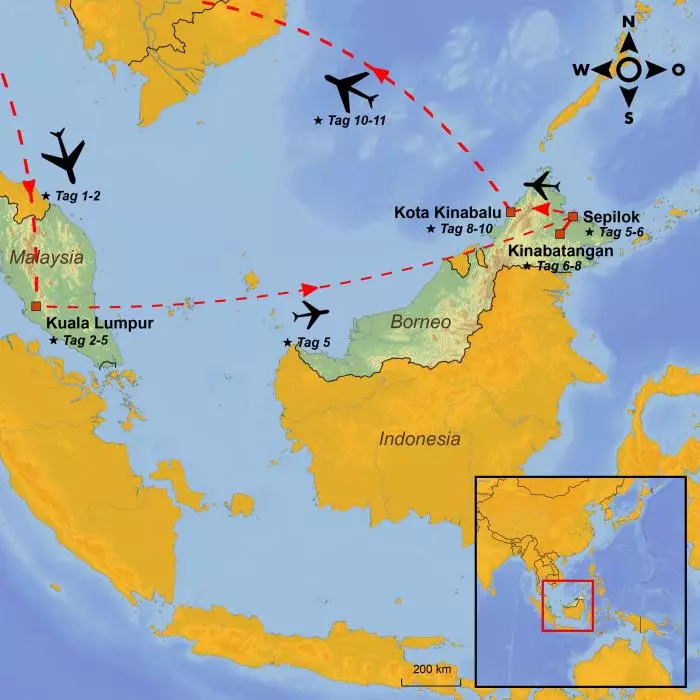 Heute setzen Sie Ihre Reise fort, Sie lassen die Sehenswürdigkeiten Kuala Lumpurs hinter sich und fliegen nach Borneo , die drittgrößte Insel der Welt. Der Süden Borneos gehört größtenteils zu Indonesien, während sich das kleine Land Brunei zwischen den beiden malaysischen Bundesstaaten Sabah und Sarawak bis in denNorden erstreckt. Diese Bundesstaaten bieten eine Fülle an spektakulären Natur- und Tiererlebnissen.
