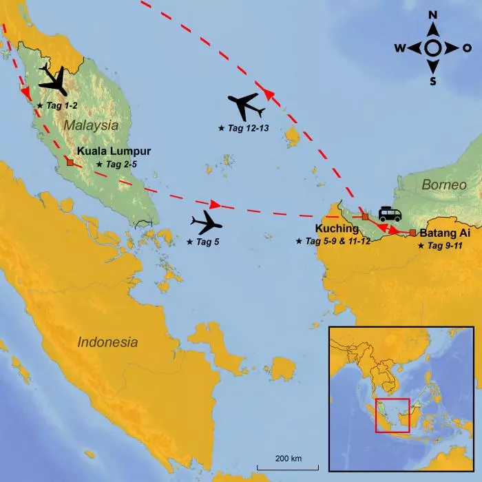 Ihre Reise beginnt in der charmanten Hauptstadt Malaysias, Kuala Lumpur, und führt Sie weiter in den malaysischen Staat Sarawak auf Borneo, und verspricht unvergessliche Erinnerungen sowie ein tieferes kulturelles Verständnis dieser faszinierenden Weltregion.