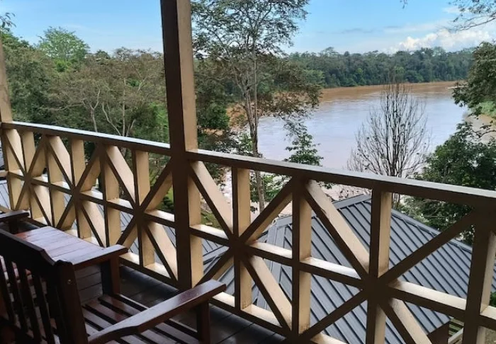 Hoch über dem Ufer des Kinabatangan-Flusses thront die Hornbill Lodge und bietet eine erstklassige Aussicht auf den sich schlängelnden Fluss und den umliegenden üppigen Regenwald.