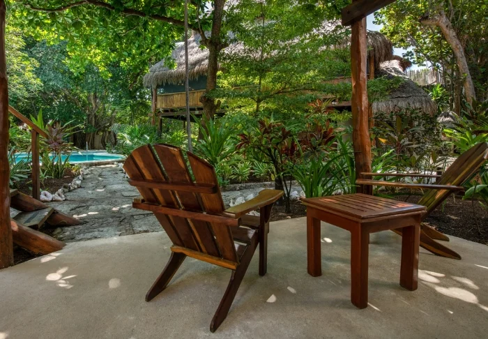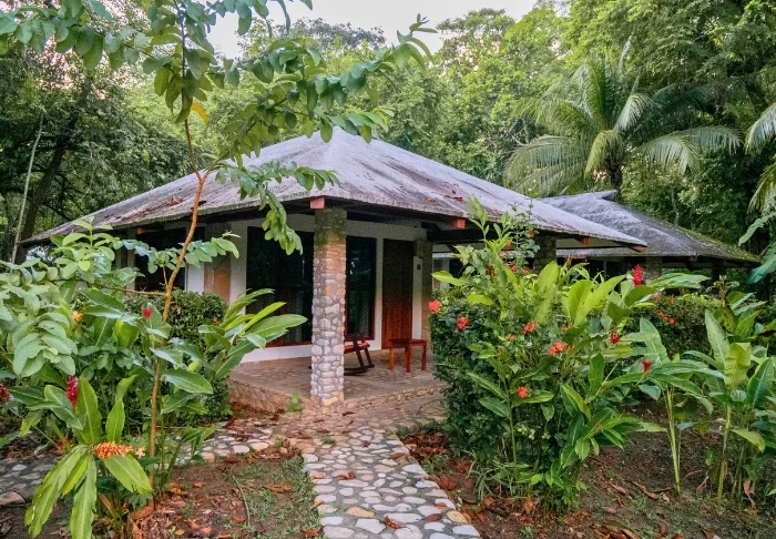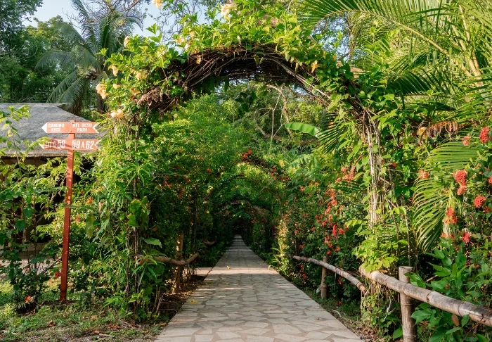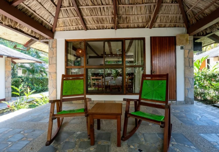 Die Unterkünfte sind über den üppigen Garten verteilt, und die vielen Bäume bieten sowohl angenehmen Schatten und Schutz vor der Sonne als auch ein zusätzliches Naturerlebnis, da wunderschöne exotische Vögel zu Besuch kommen. Manchmal haben Sie auch das Glück, eine faule Eidechse oder einen Leguan zu sehen, die von einem Baum herunter krabbeln.