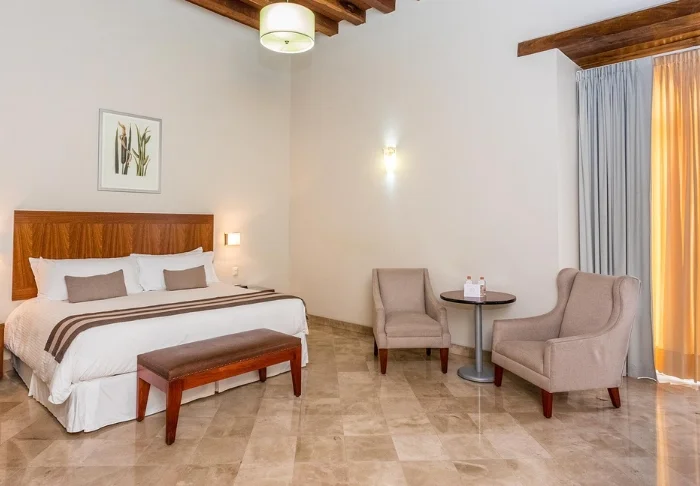 Die insgesamt 78 Zimmer sind in warmen Farben gehalten und mit klassischen mexikanischen Holzmöbeln eingerichtet, die für ein gemütliches und authentisches Ambiente sorgen. Die Zimmer verfügen außerdem über einen Safe, Kabel-TV, WLAN und ein eigenes Bad mit Haartrockner.