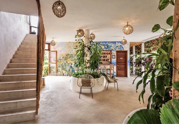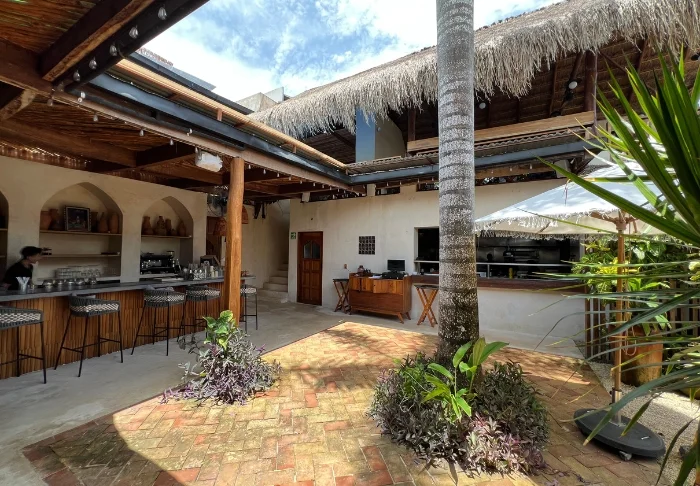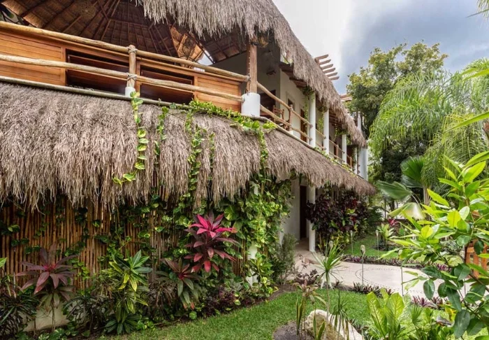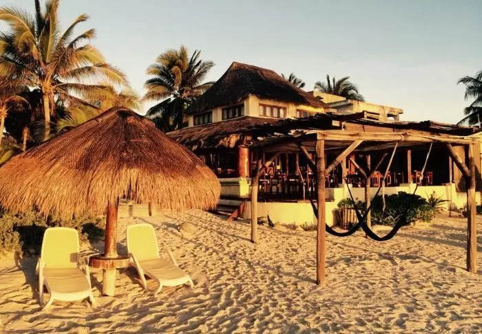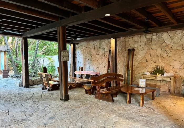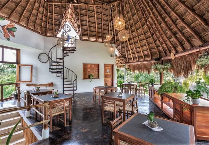 Sowohl der Empfangsbereich als auch das Restaurant des Hotels sind unter einem hohen, strohgedeckten Palapa untergebracht. Dies ist ein traditioneller mexikanischen Baustil, bei dem natürliche Materialien wie Holz, Bambus und getrocknete Palmblätter verwendet werden. Die offenen Seiten und das luftige Dach sind nicht nur sehr schön, sondern sorgen auch für gute Belüftung und eignen sich daher ideal für heiße und feuchte Klimazonen.