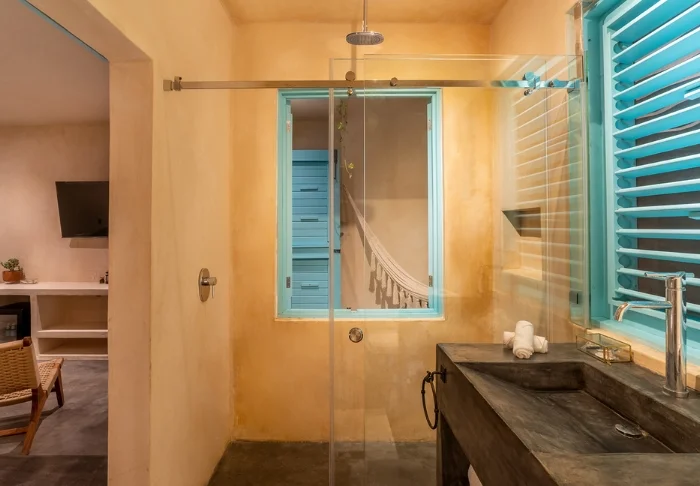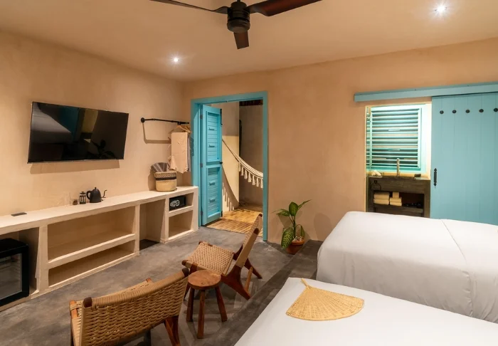 Das Hotel verfügt über nur 58 Zimmer, die elegant in hellen Farben und mit stimmungsvoller mexikanischer Kunst an den Wänden eingerichtet sind. Zur Ausstattung gehören ein Badezimmer mit Pflegeprodukten und Haartrockner, Klimaanlage, Deckenventilator, Safe, WLAN, Fernseher, Kühlschrank und einer kleinen Terrasse oder einem Balkon mit Hängematte.